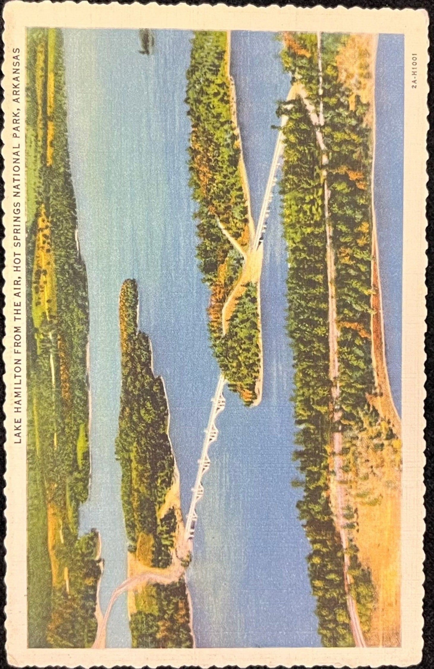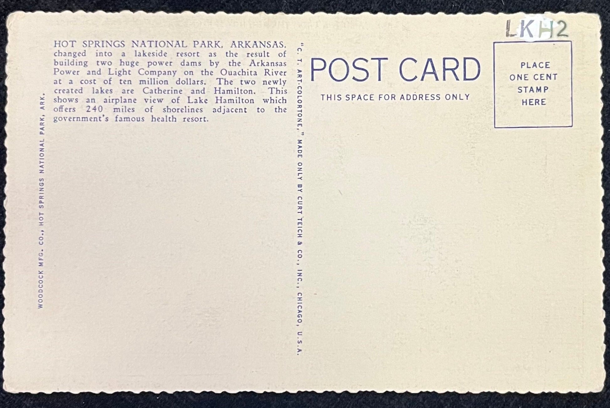 Back: "Hot Springs National Park, Arkansas, changed into a lakeside resort as the result of building two huge power dams by the Arkansas Power and Light Company on the Ouchita River at a cost of ten million dollars. The two nearly created lakes are Catherine and Hamilton. This shows an airplane view of Lake Hamilton which offers 240 miles of shorelines adjacent to the governments famous health resort.