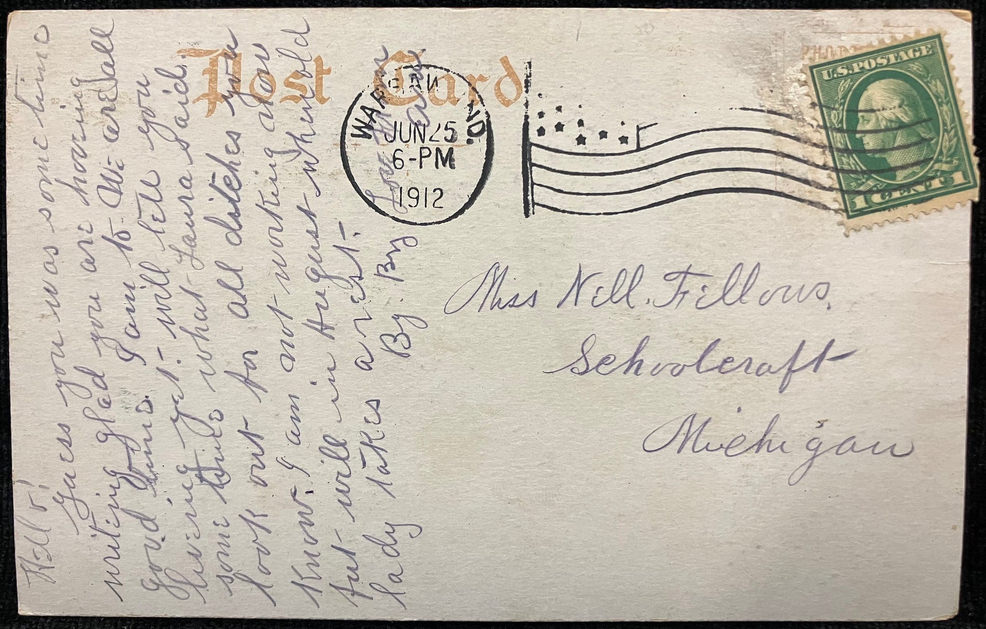 Mailed: Postmark: 1912 Warsaw, Ind. green one cent George Washington stamp
