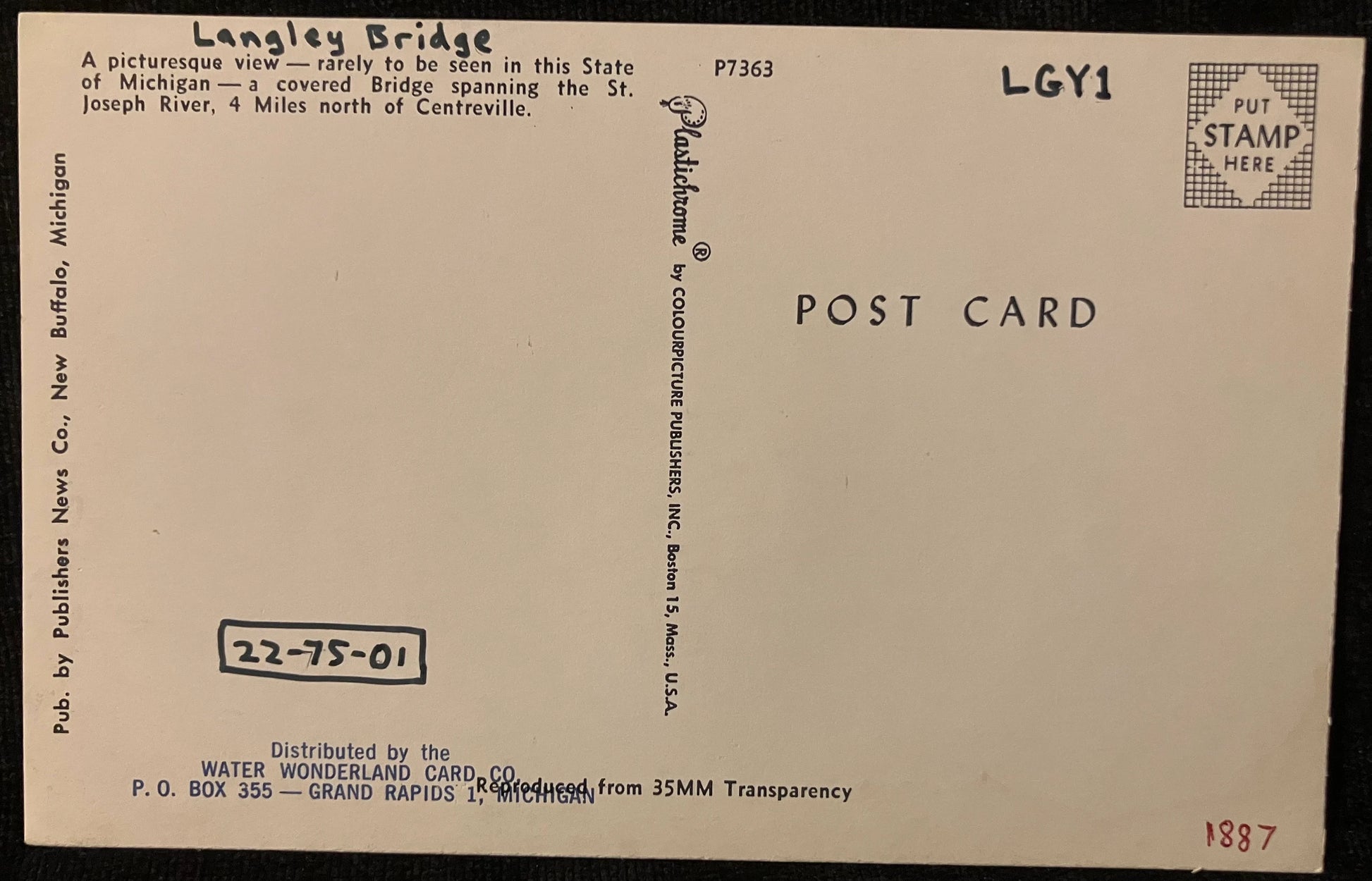 On front: Langley Bridge over St. Joseph River near Centreville, Michigan