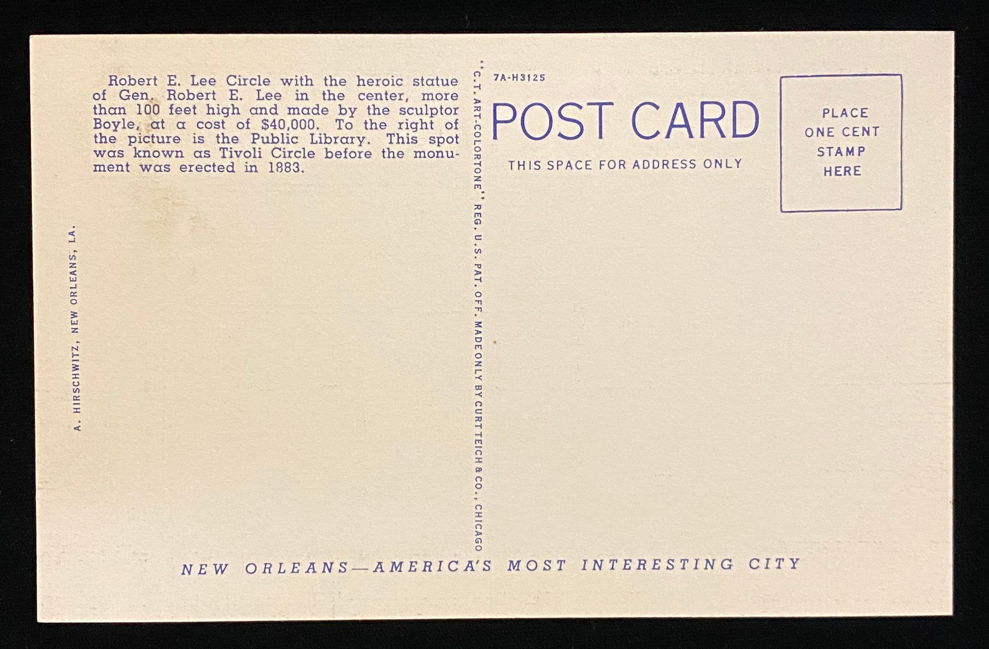 Back: "Robert E. Lee Circle with the heroic statue of Gen. Robert E. Lee in the center, more than 100 feet high and made by the sculptor Boyle, at a cost of $40,000. To the right of the picture is the Public Library. This spot was known as Tivoli Circle before the monument was erected in 1883."