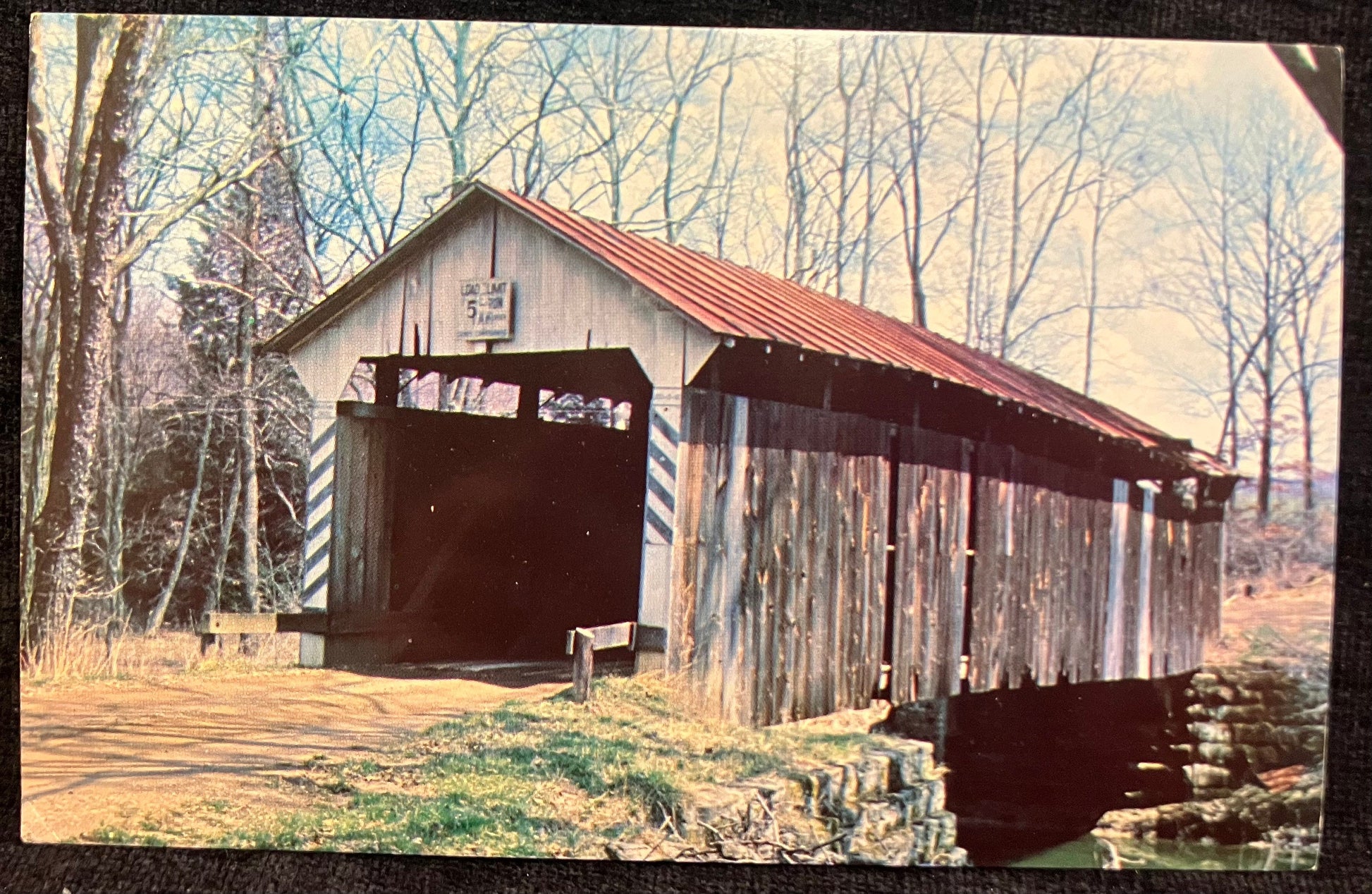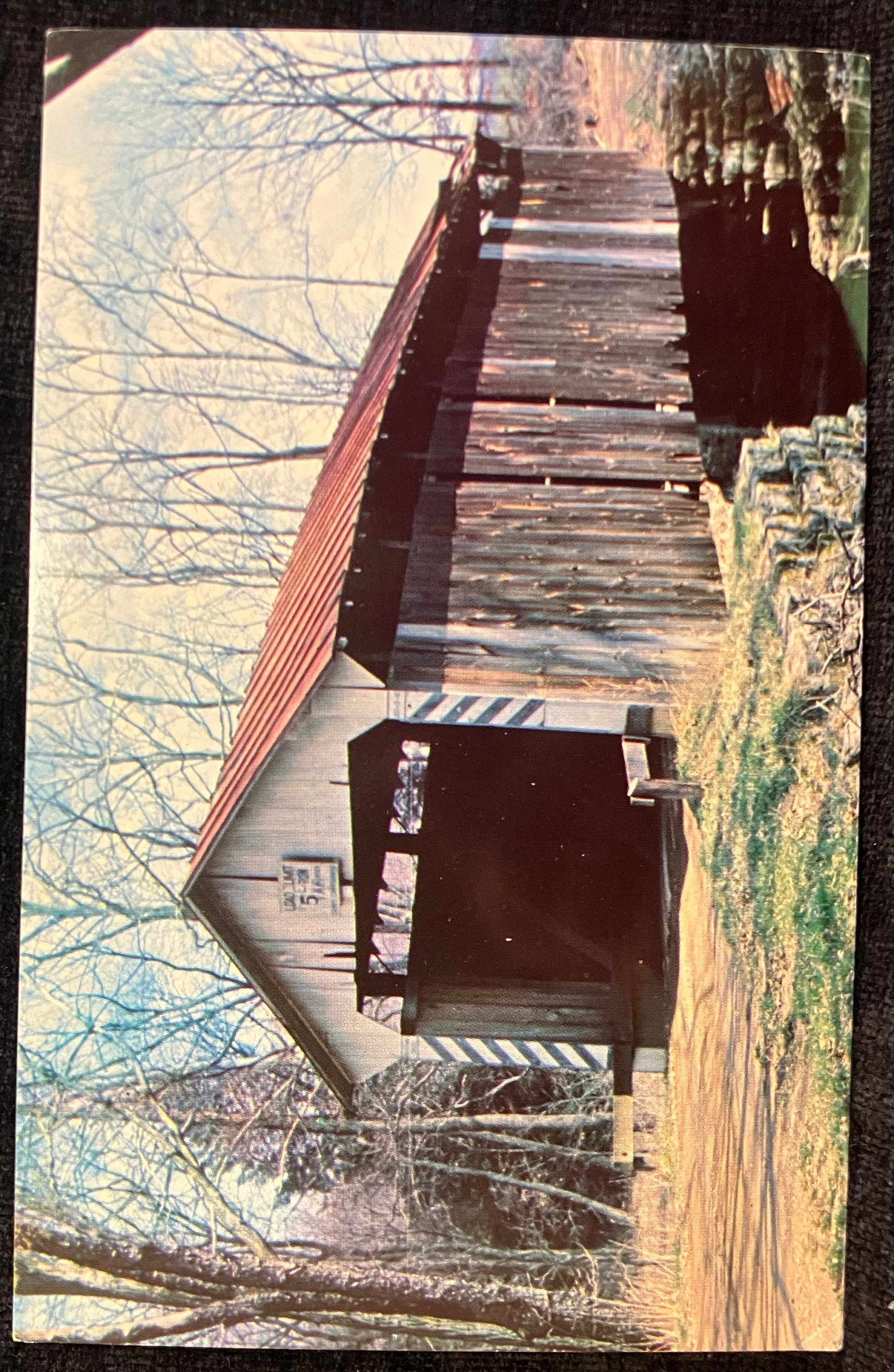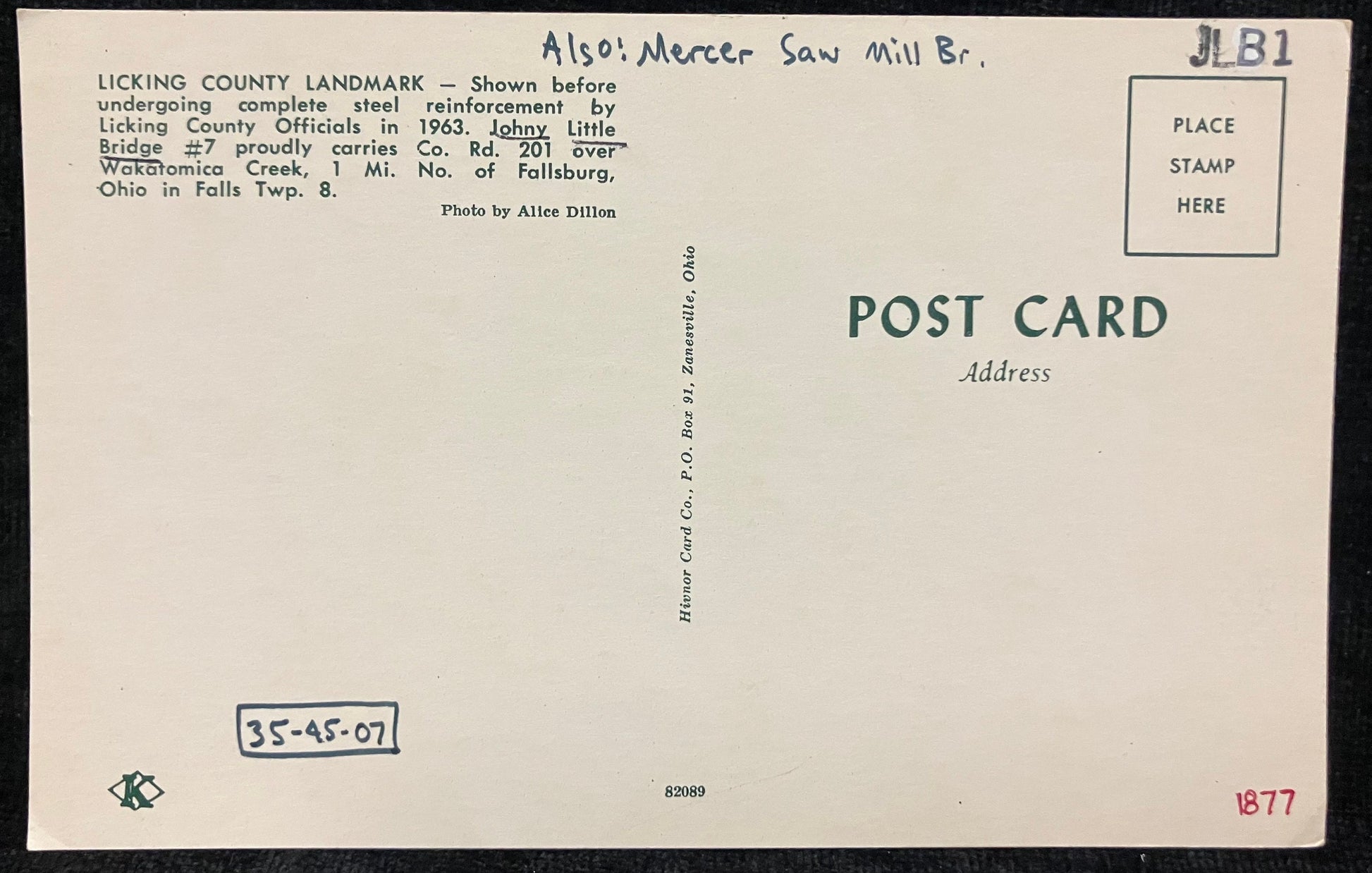 On back: LICKING COUNTY LANDMARK - Shown before undergoing complete steel reinforcement by Licking County Officials in 1963. Johnny Little Bridge #7 proudly carries Co. Rd. 201 over Wakatomica Creek, 1 Mi. No. of Fallsburg, Ohio in Falls Twp. 8.