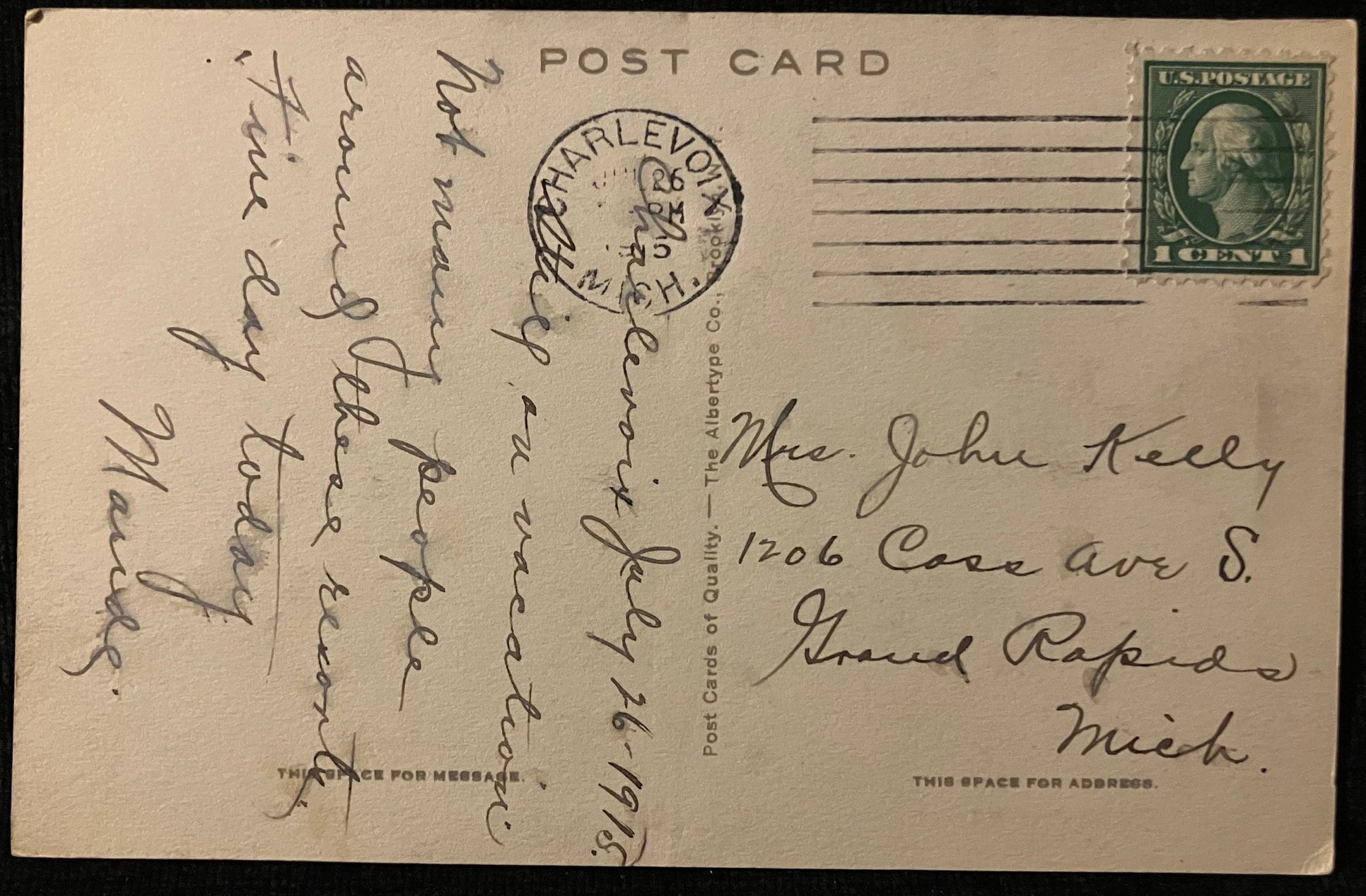 Mailed: Postmark on Jun 26, 1915, from Charlevoix, Mich., with a green one-cent George Washington stamp