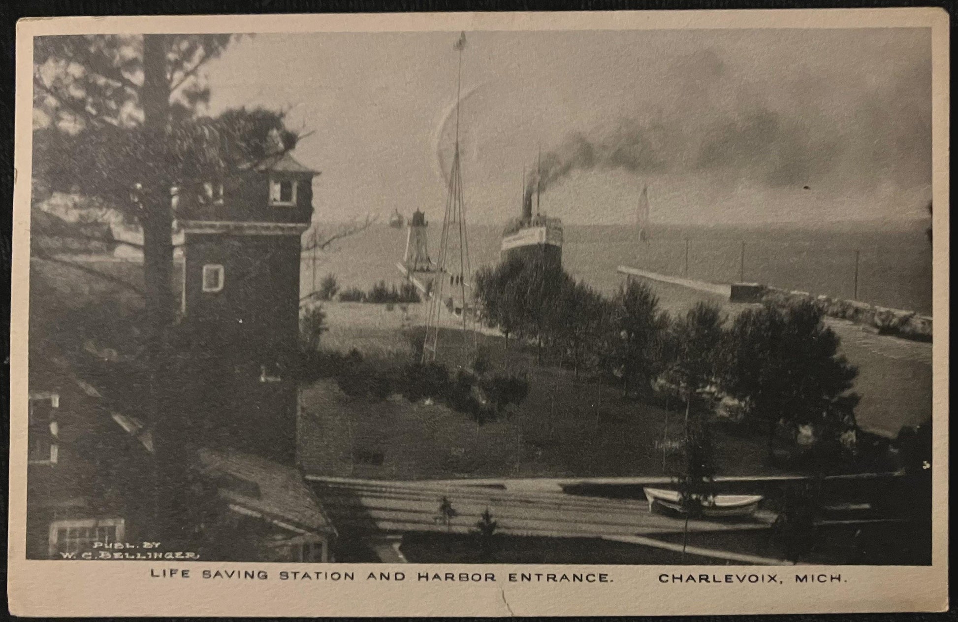 On front: Life Saving Station and Harbor Entrance. Charlevoix, Mich. Publ. By W. C. Bellinger