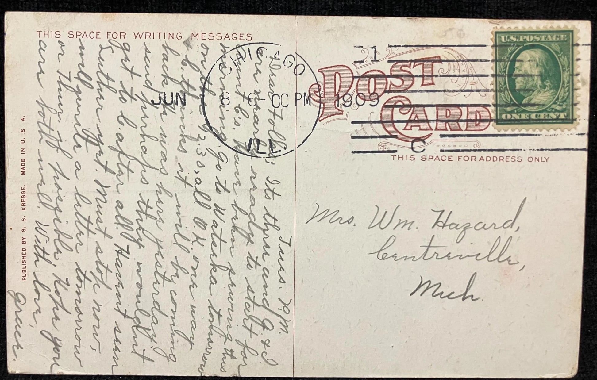 Mailed: Postmark 1908 green one cent Benjamin Franklin stamp
