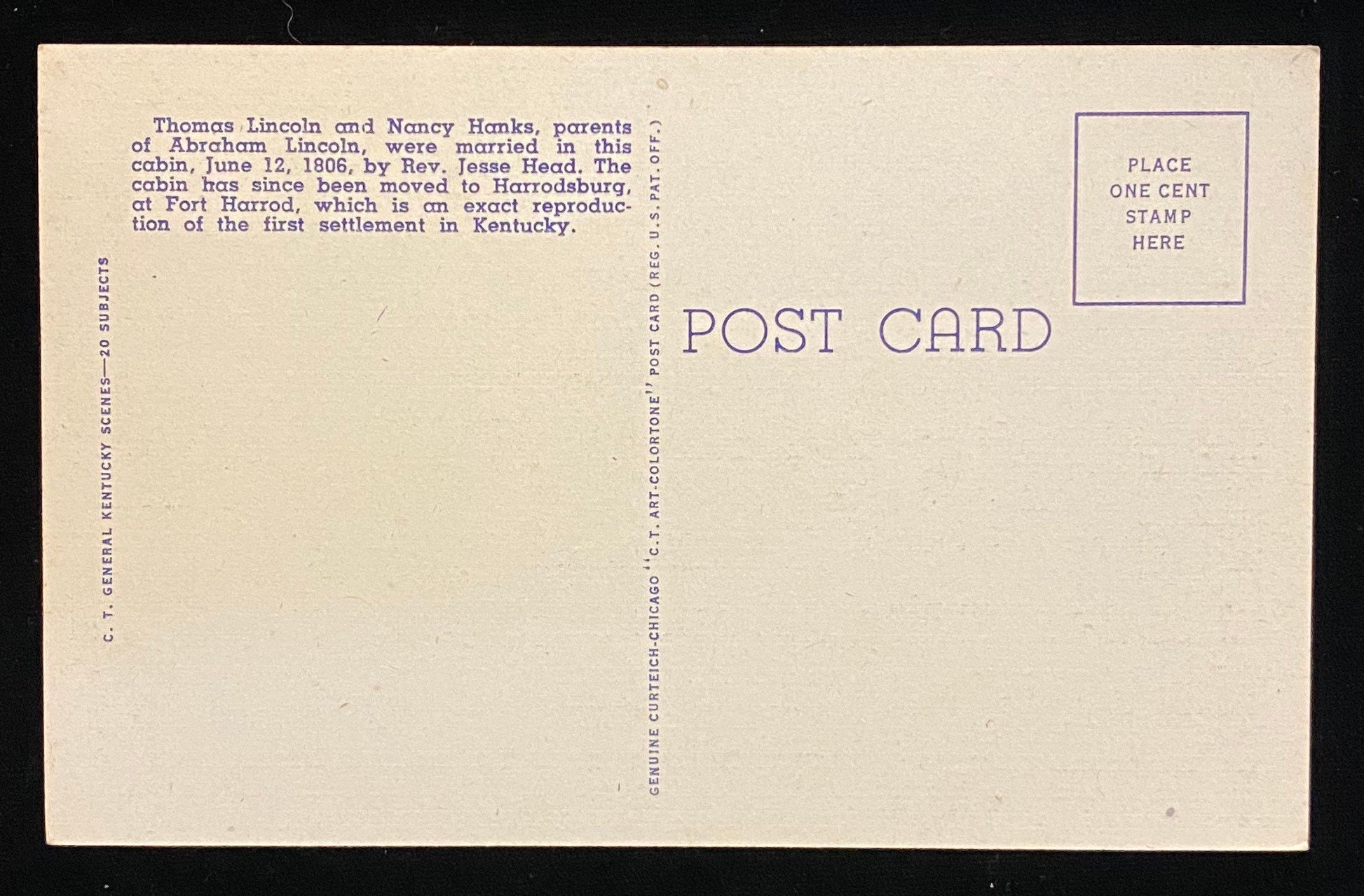 Back: "Thomas Lincoln and Nancy Hanks, parents of Abraham Lincoln, were married in this cabin, June 12, 1806, by Rev. Jesse Head. The cabin has since been moved to Harrodsburg, at Fort Harrod, which is an exact reproduction of the first settlement in Kentucky."