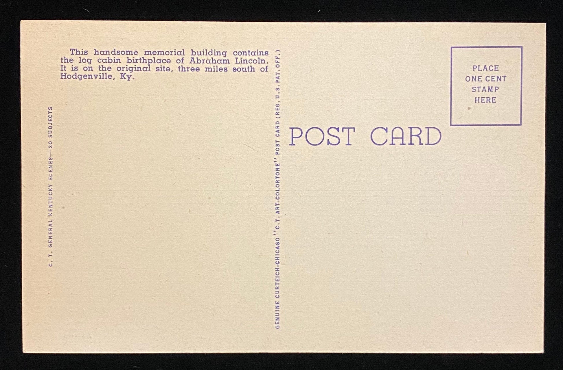 Back: "This handsome memorial building contains the log cabin birthplace of Abraham Lincoln. It is on the original site, three miles south of Hodgenville, Ky."