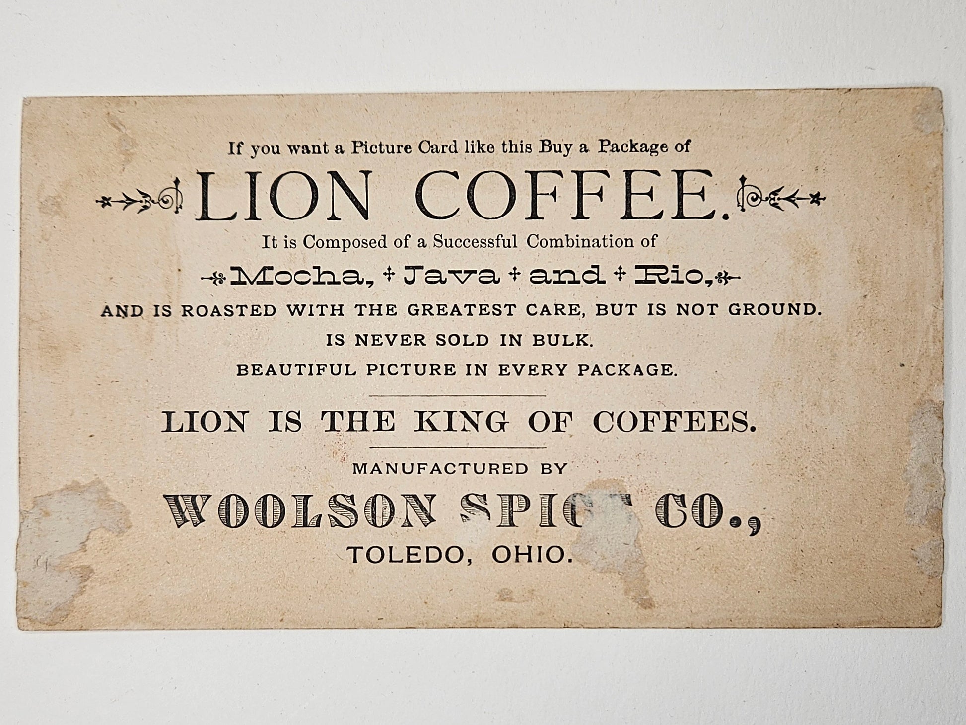 Back: If you want a picture card like this buy a package of LION COFFEE It's composed of a successful combination of MOCHA, JAVA, and RIO And is roasted with the greatest care, but never ground. Never sold in Bulk. Beautiful picture in every package. Lion is the King of Coffees. Woolson Spice Co. Toledo, Ohio. Dimensions: 6" by 3.5"