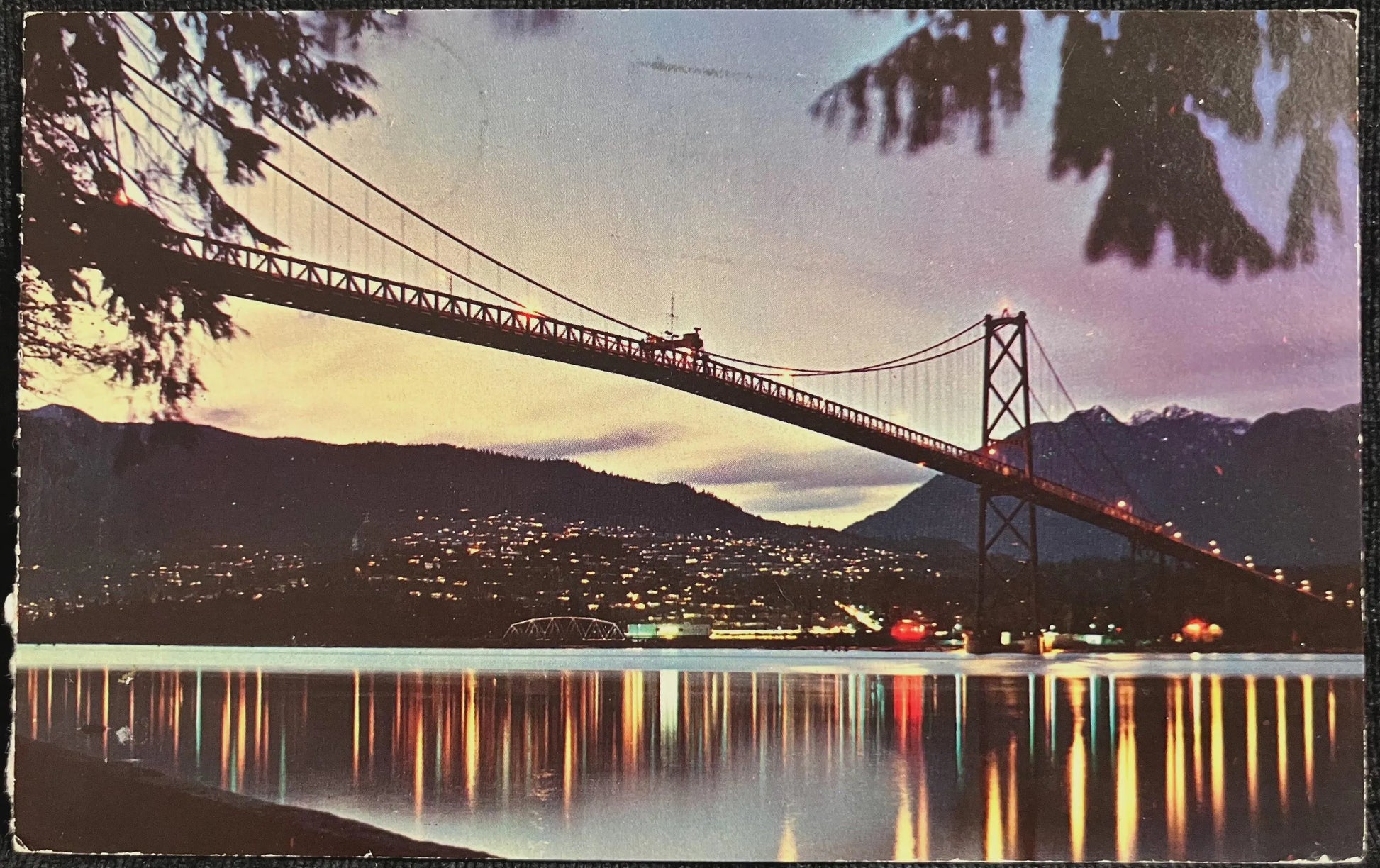 On front: A photo of Lions Gate Bridge at dusk, Vancouver, B.C., Canada