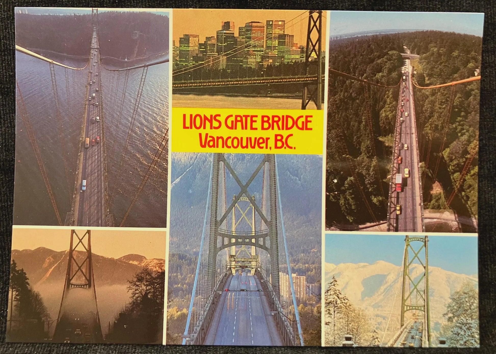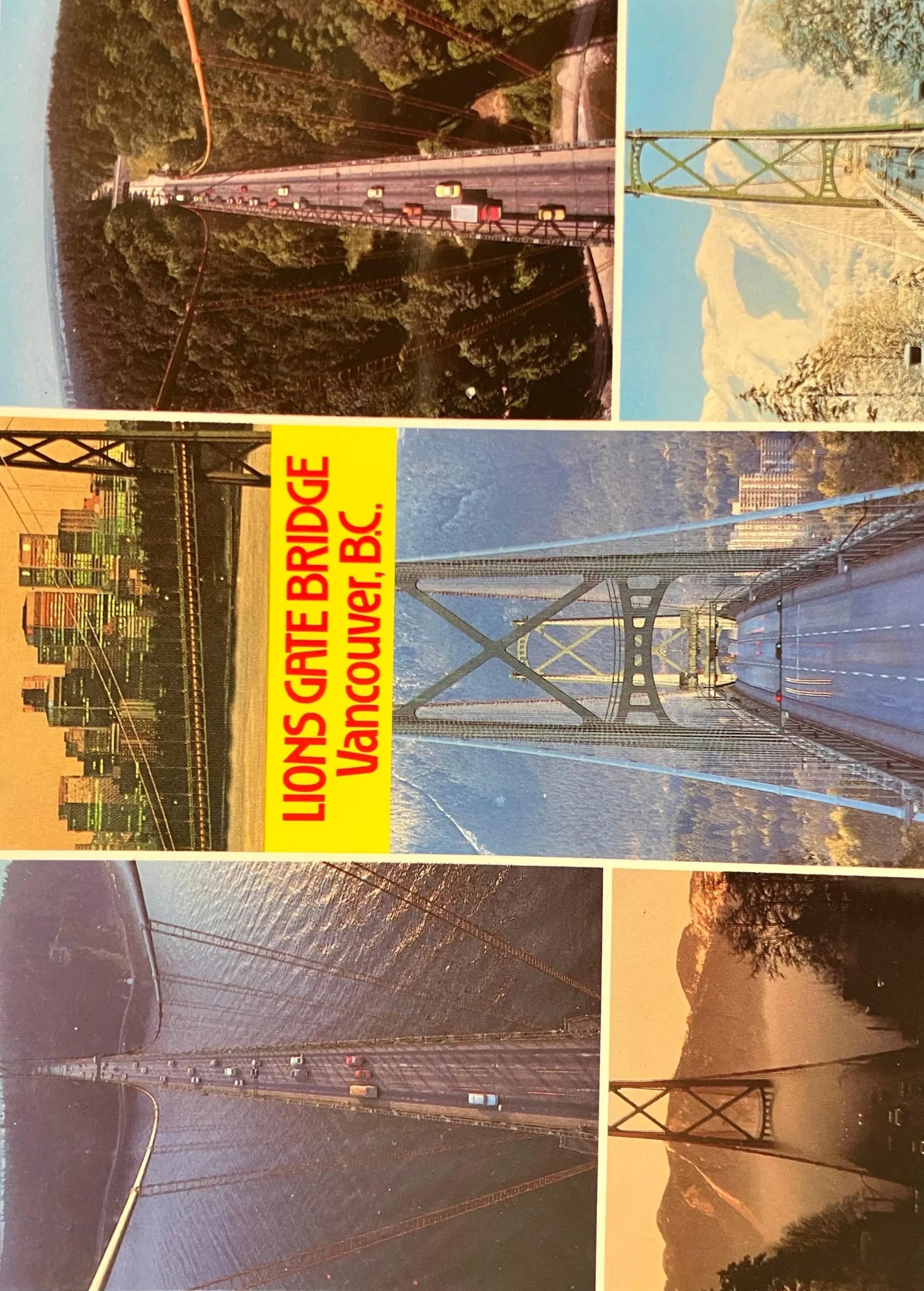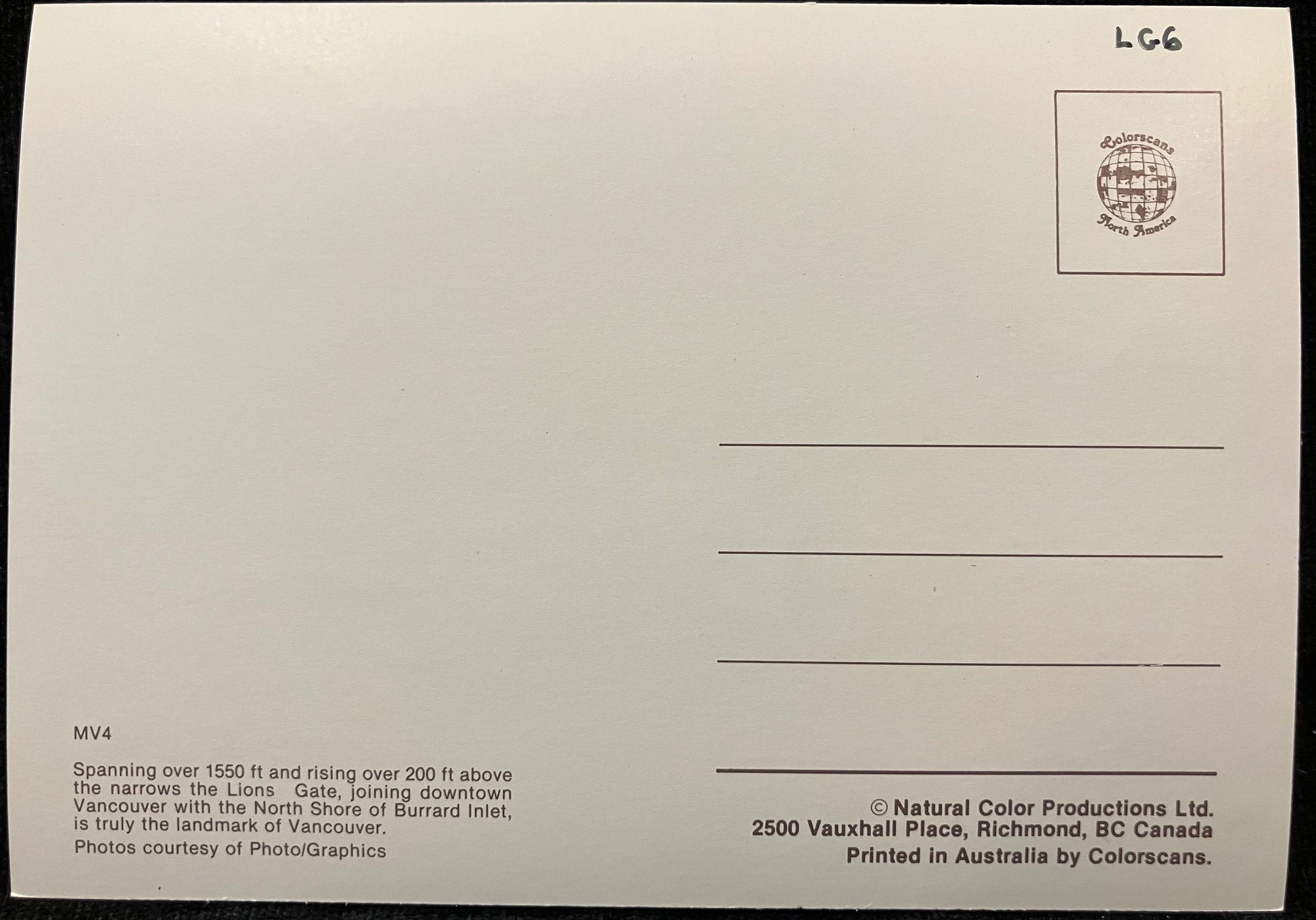 On back: Spanning over 1550 ft and rising over 200 ft above the narrows the Lions Gate, joining downtown Vancouver with the north Shore of Burrard Inlet, is truly the landmark of Vancouver.