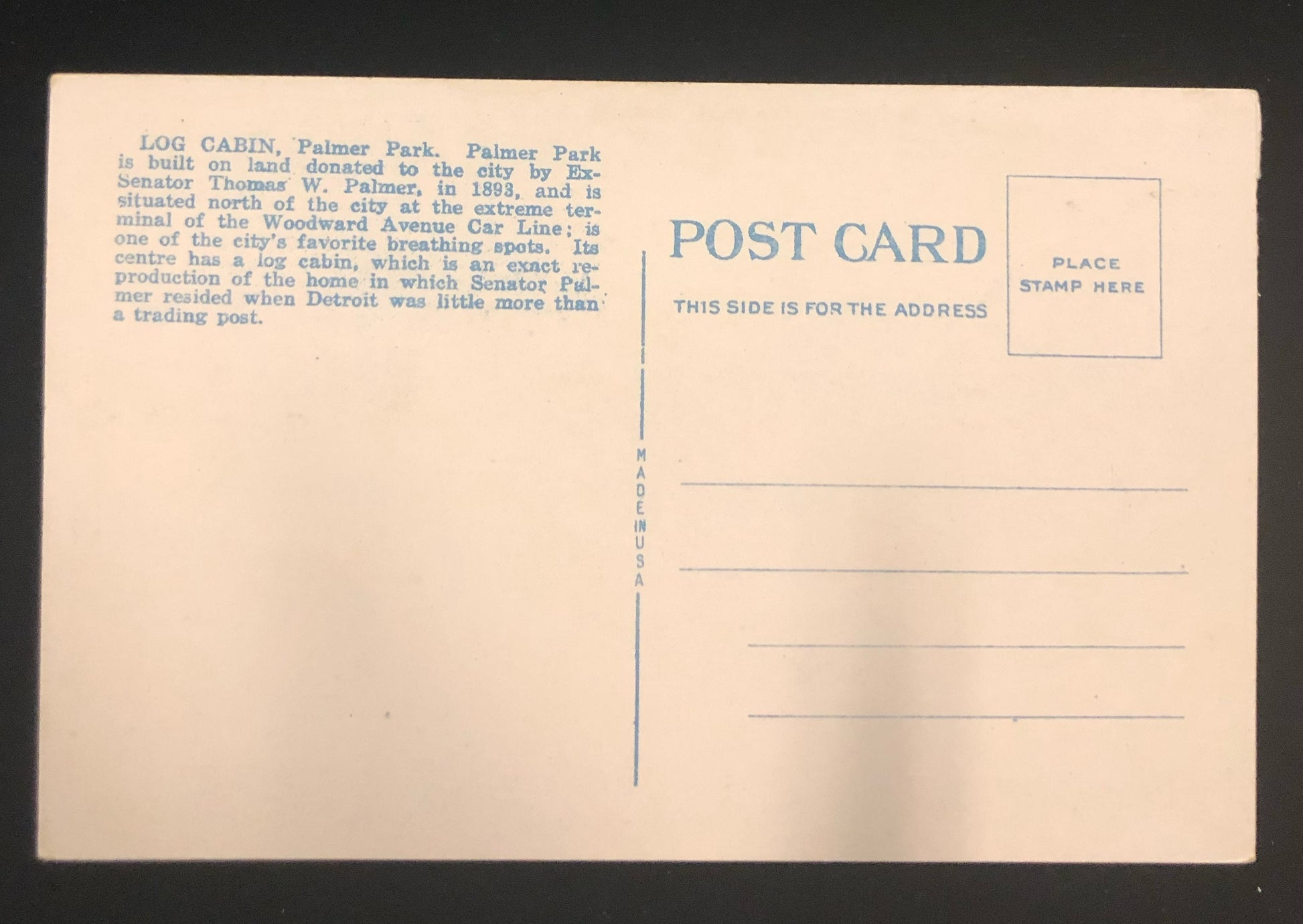 Back information: "Log Cabin, Palmer Park. Palmer Park is built on land donated to the city by Ex-Senator Thomas W. Palmer, in 1893, and is situated north of the city at the extreme terminal of the Woodward Avenue Car Line; is one of the Woodward Avenue Car Lines; is one of the city's favorite breathing spots. Its centre has a log cabin, which is an exact reproduction of the home in which Senator Palmer resided when Detroit was little more than a trading post."