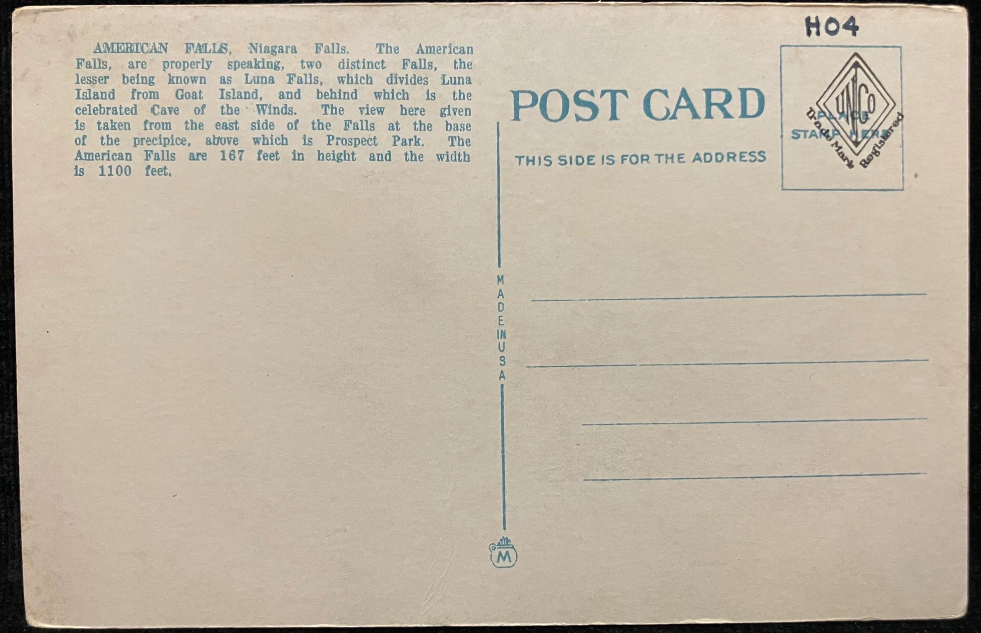 On back: AMERICAN FALLS, Niagara Falls. The American Falls, are properly speaking, two distinct Falls, the lesser being known as Luna Falls, which divides Luna Island from Goat Island from Goat Island, and behind which is the celebrated Cave of the Winds. The view here given is taken from the east side of the Falls at the base of teh precipice, above which is Prospect Park. The American Falls are 167 feet in height and the width is 1100 feet.