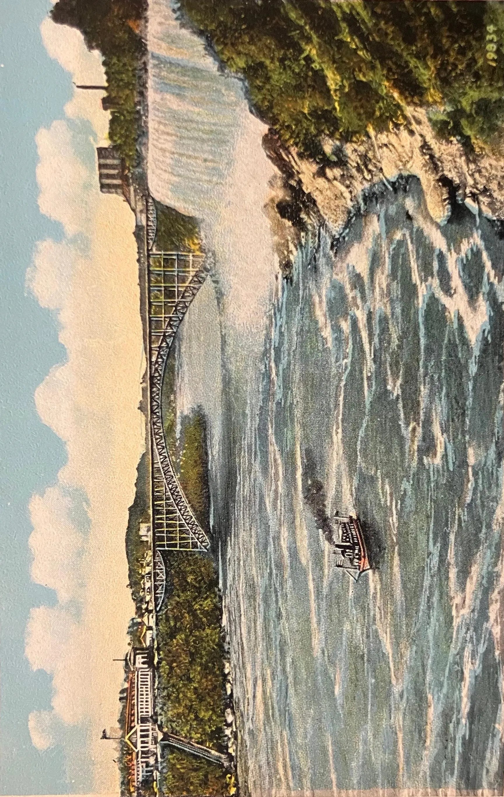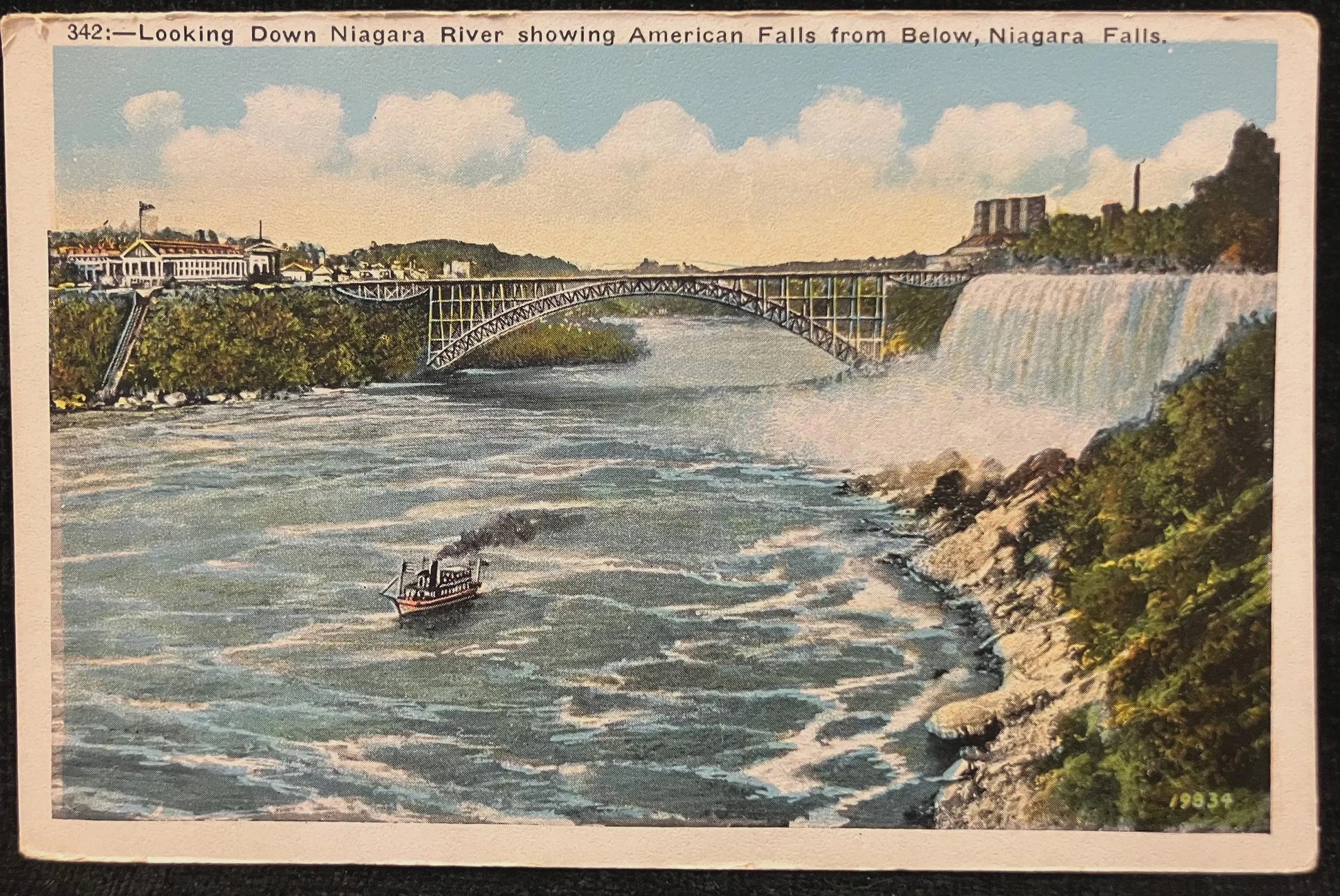 On front: Looking Down Niagara River showing American Falls from Below, Niagara Falls.