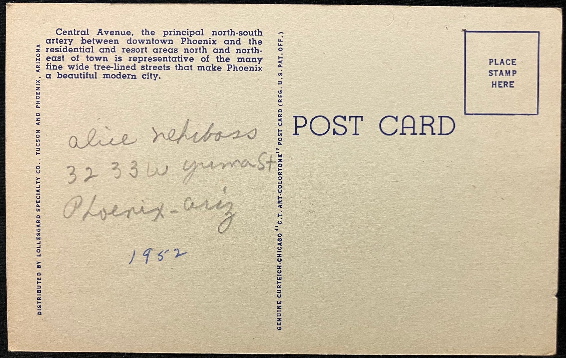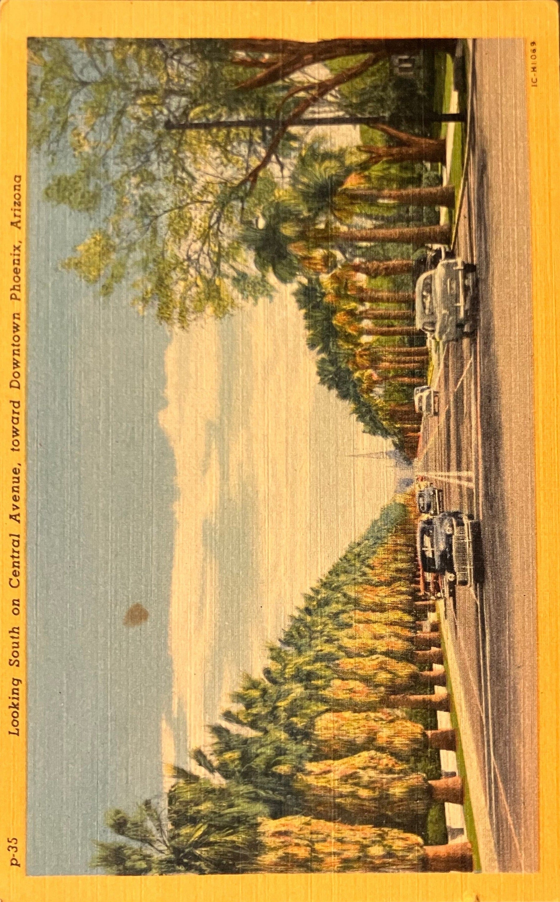 Back: Central Avenue, the principal north-south artery between downtown Phoenix and the residential and resort areas north and northeast of town is representative of the many fine wide tree-lined streets that make Phoenix a beautiful modern city.