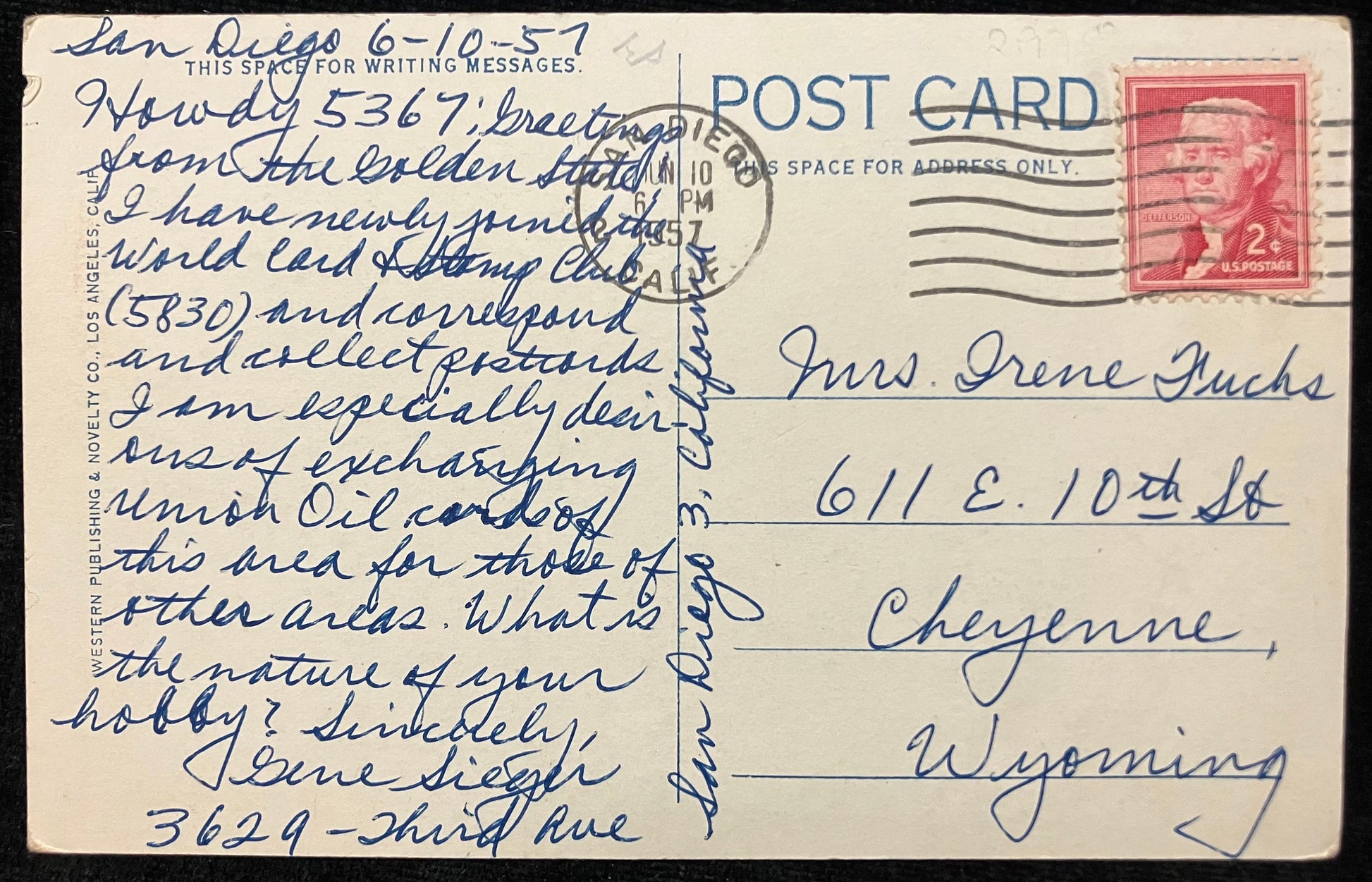 Mailed: Postmark on June 10, 1957 from San Diego, California with a red two cent Thomas Jefferson stamp