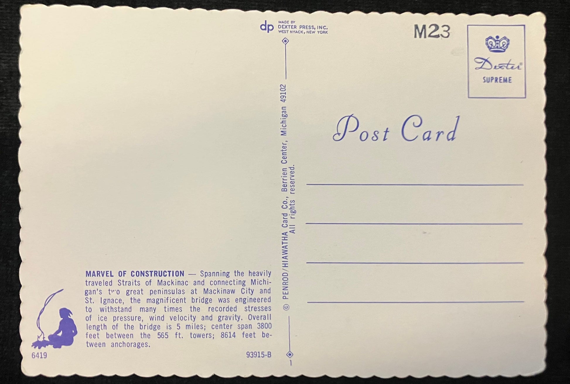 On back: Marvel of Construction - Spanning the heavily travelled Straits of Mackinac, and connecting Michigan’s Upper Peninsula to the Great Peninsula at Mackinaw City, and St. Ignace, the magnificent bridge was engineered to withstand many times the recorded stresses of ice pressure, wind, velocity and gravity. Overall length of the bridge is 5 miles; center span 3800 feet between the 565 ft. towers; 8614 feet between anchorages.