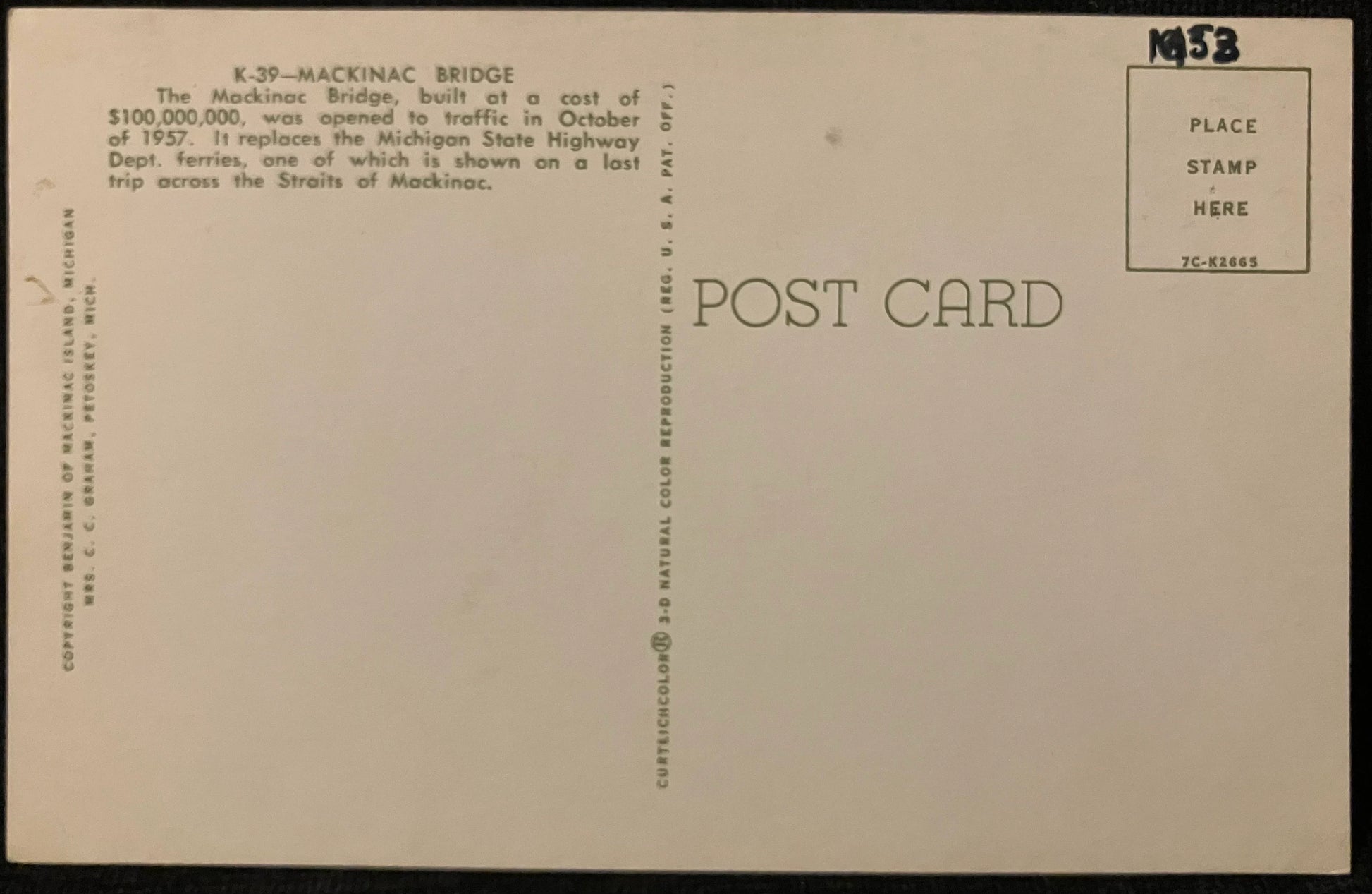 On back: K-39 - Mackinac Bridge The Mackinac Bridge, built t a cost of $100,000,000, was opened to traffic in October of 1957. It replaces the Michigan State Highway Dept. ferries, one of which is shown on a last trip across the Straits of Mackinac.