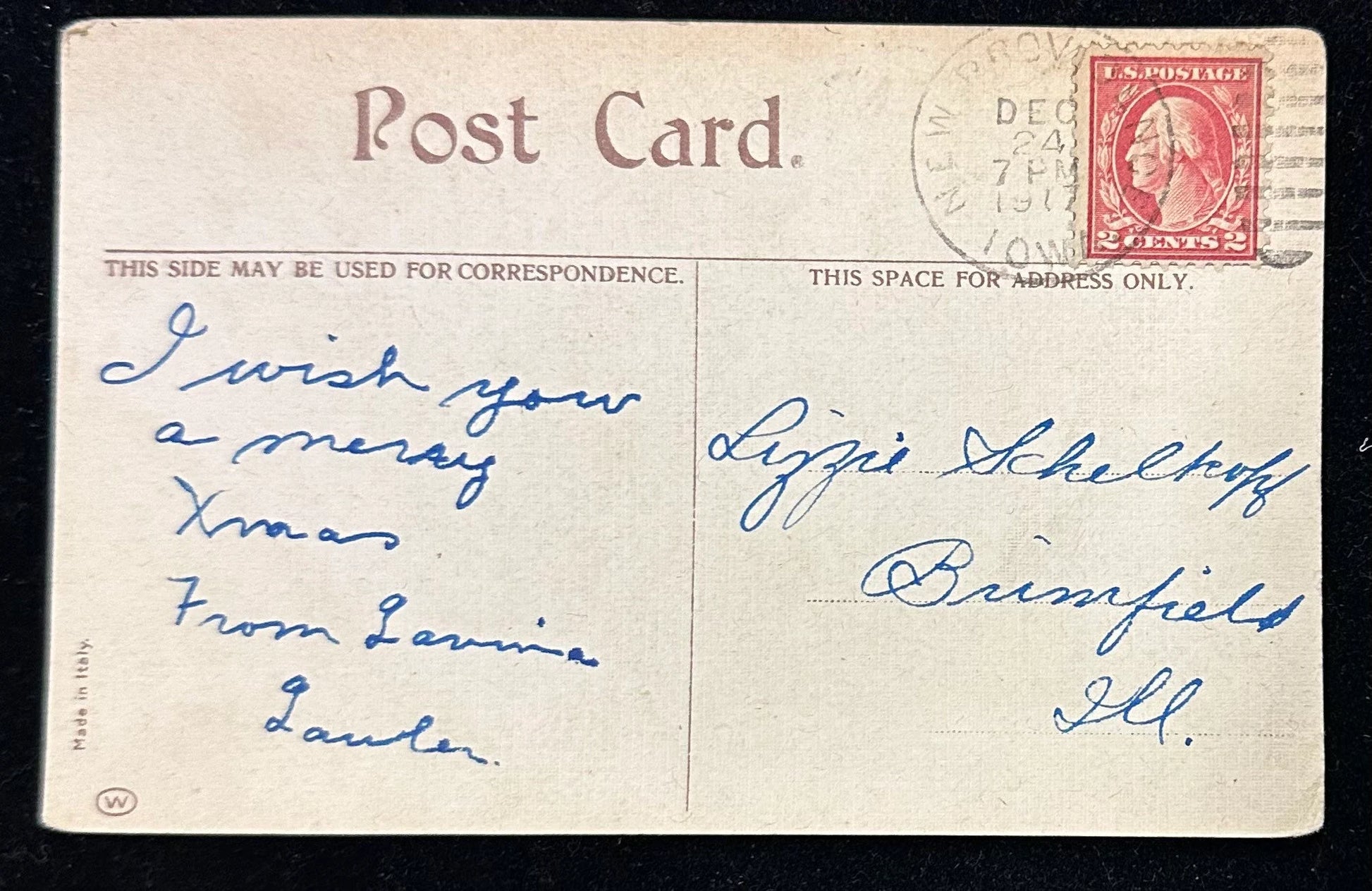 Mailed: Posted on December 24th, 1917 from New Providence, Iowa with a Carmine 2 cent George Washington stamp