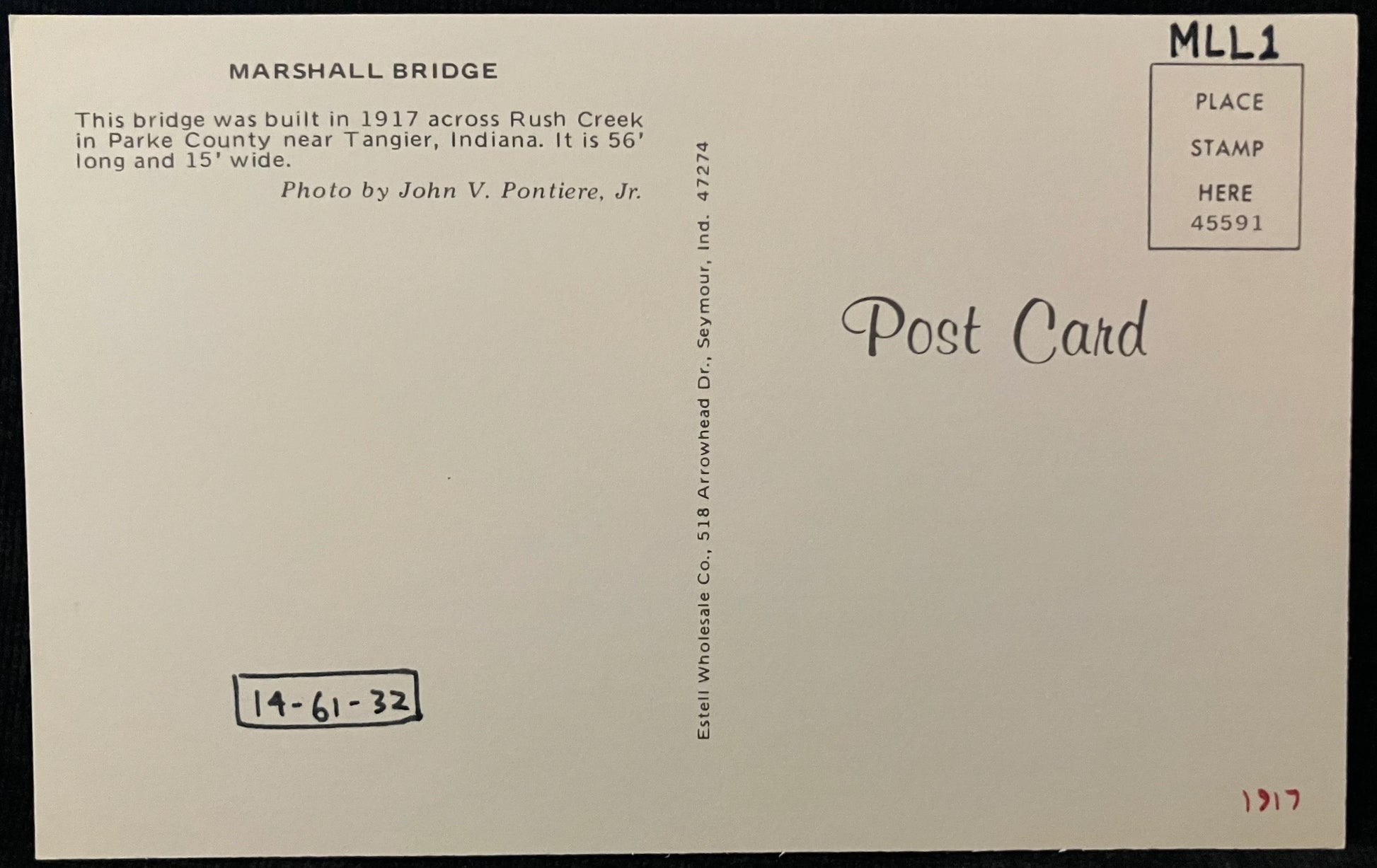 On back: MARSHALL BRIDGE. This bridge was built in 1917 across Rush Creek in Parke County near Tangier, Indiana. It is 56' long and 15' wide.