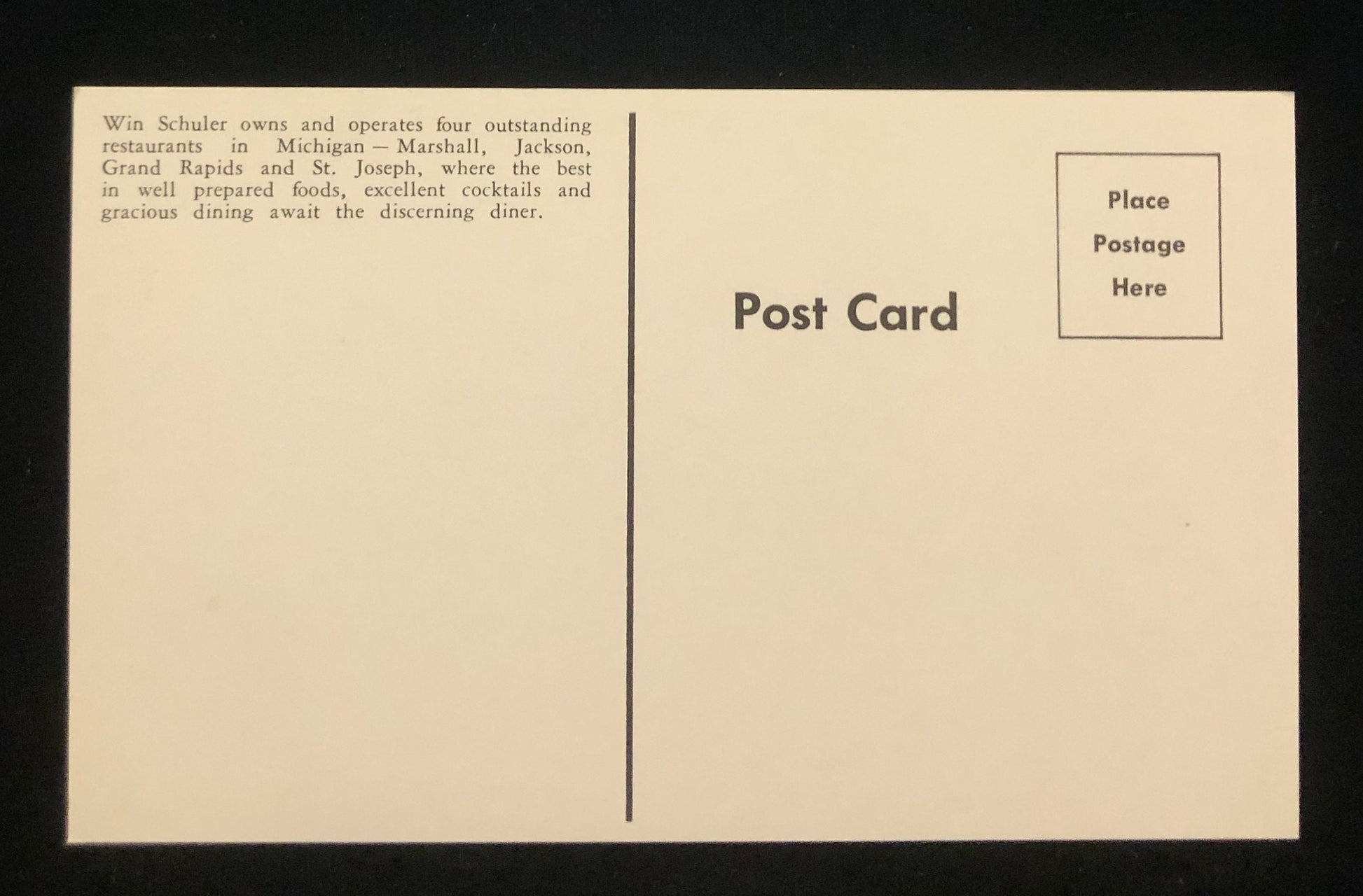 Marshall MI Win Schuler's Restaurant Advertising Vintage Postcard
