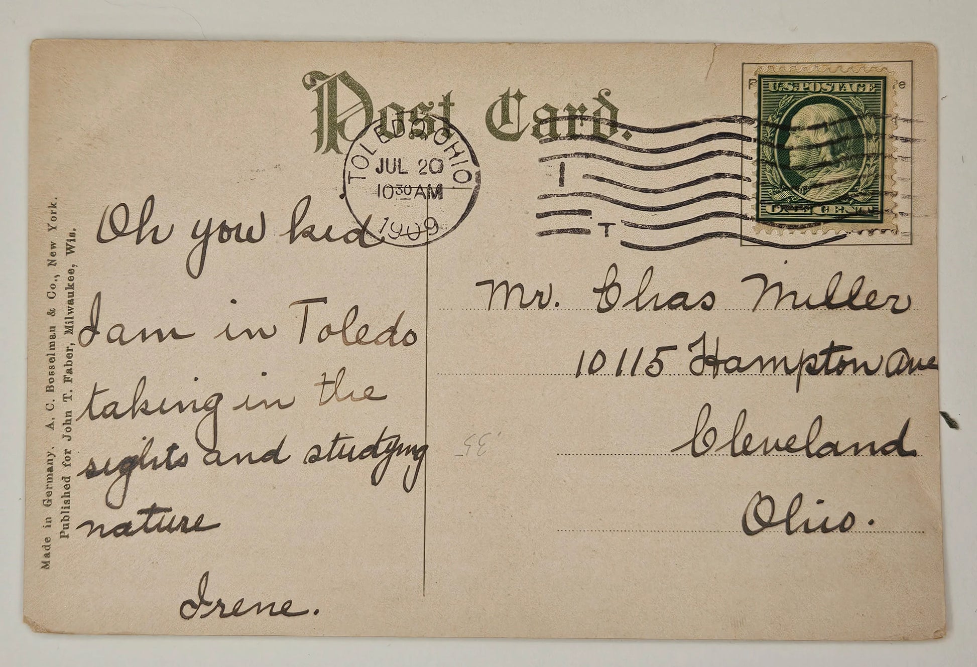 Mailed on July 20, 1909, from Toledo, Ohio, with a green one-cent stamp