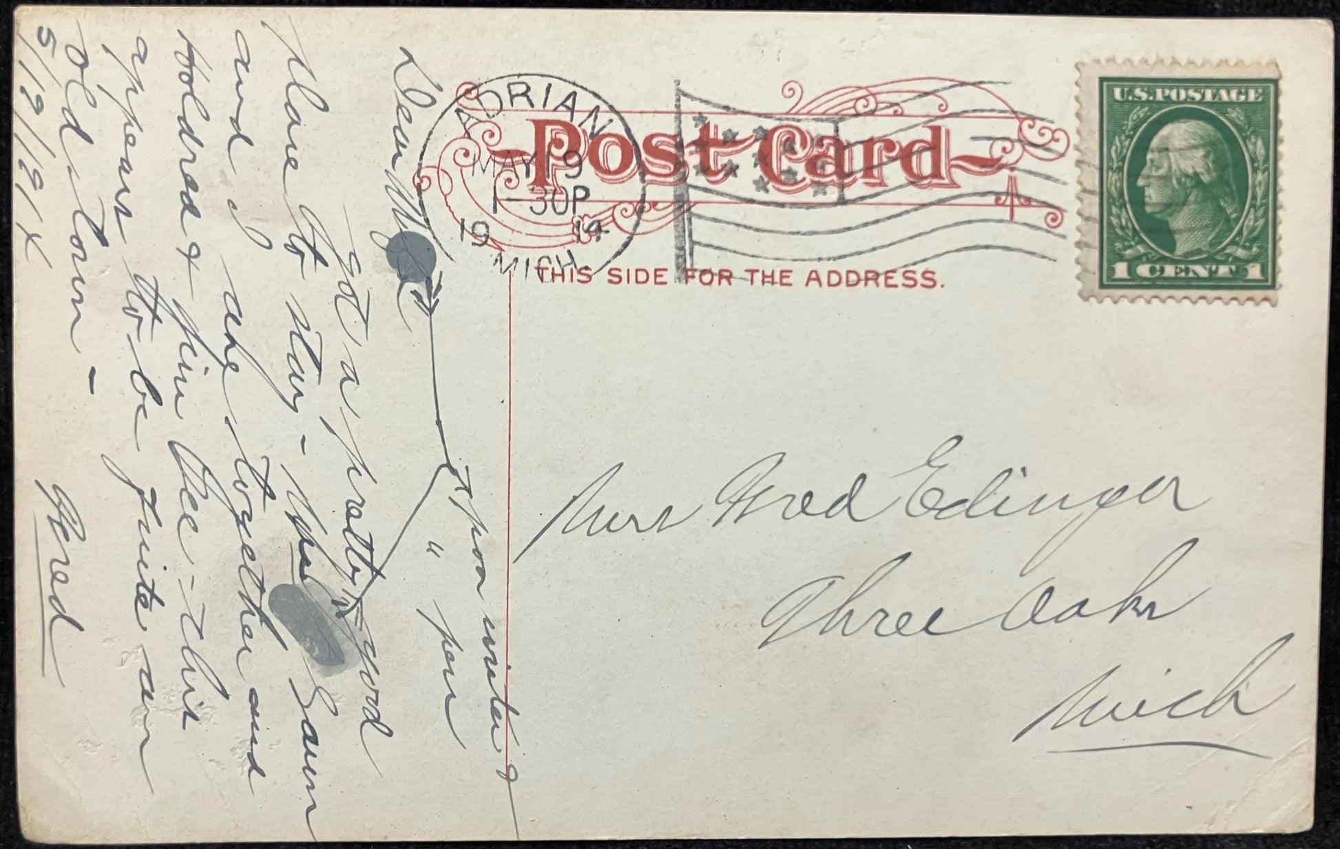 Mailed: Postmark: 1914 green one-cent George Washington stamp