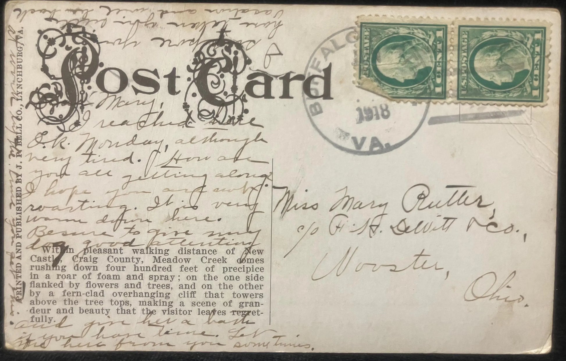 Back: Within pleasant walking distance of New Castle, Craig County, Meadow Creek comes rushing down four hundred feet of precipice ina roar of foam and spray; on the one side flanked by flowers and trees, and on the other by a fern-clad overhanging cliff that towers above the tree tops, making a scene of grandeur and beauty that the visitor leaves regretfully.