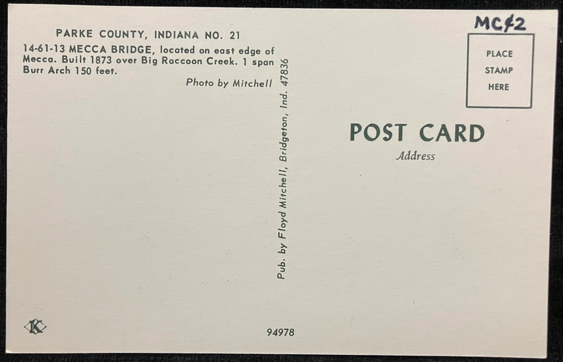 Back: PARKE COUNTY, INDIANA NO. 21 14-61-13 MECCA BRIDGE, located on east edge of Mecca. Built 1873 over Big Raccoon Creek. 1 span Burr Arch 150 feet.