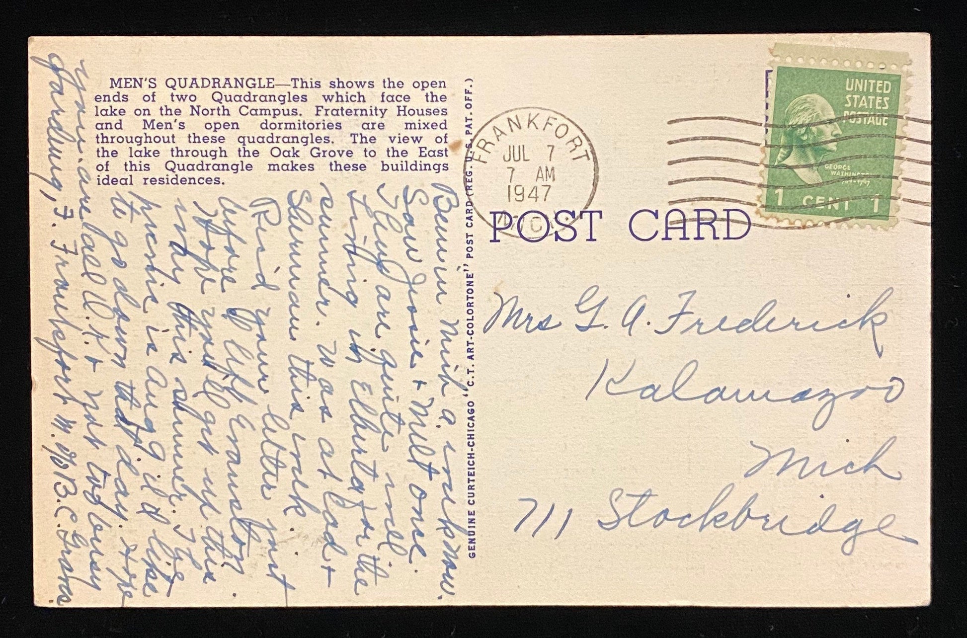 Back Information: "Men's Quadrangle - This shows the open ends of two Quadrangles which face the lake on the North Campus. Fraternity Houses and Men's open dormitories are mixed throughout these quadrangles. The view of the lake through the Oak Grove to the East of this Quadrangle makes these buildings ideal residences."