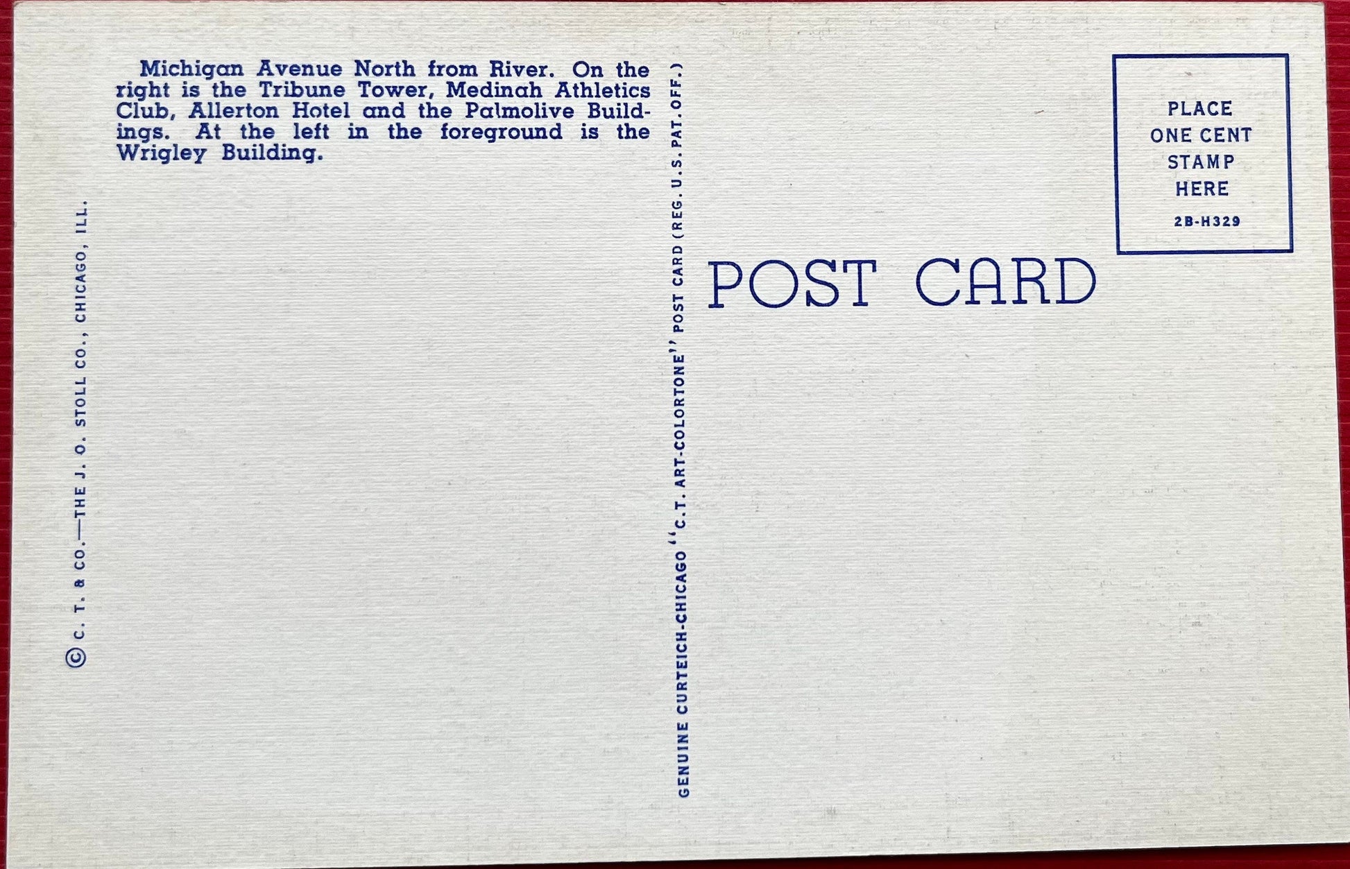 Back Text: "Michigan Avenue North from River. On the right is the Tribune Tower, Medinah Athletics Club, Allerton Hotel and the Palmolive Buildings. At the left in the foreground is the Wrigley Building."