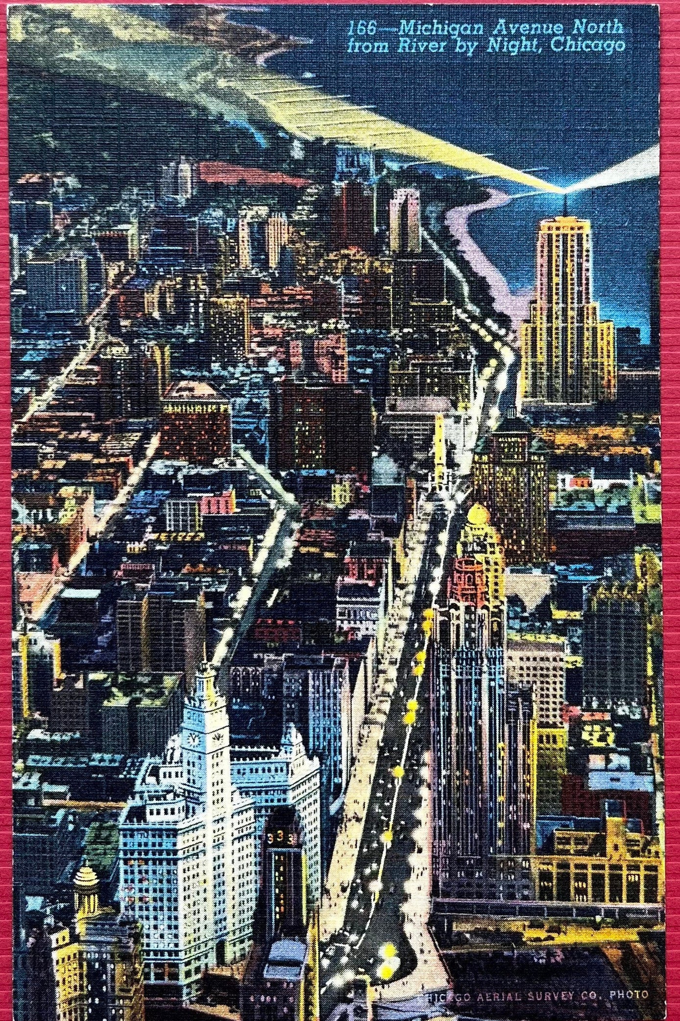 This Cur Teich Co. postcard depicts a photo taken by the Chicago Aerial Survey Co. of the nighttime in Chicago by Michigan Avenue North. Many buildings such as the Wrigley Building and Allerton Hotel are shown with the night lights shining brightly.