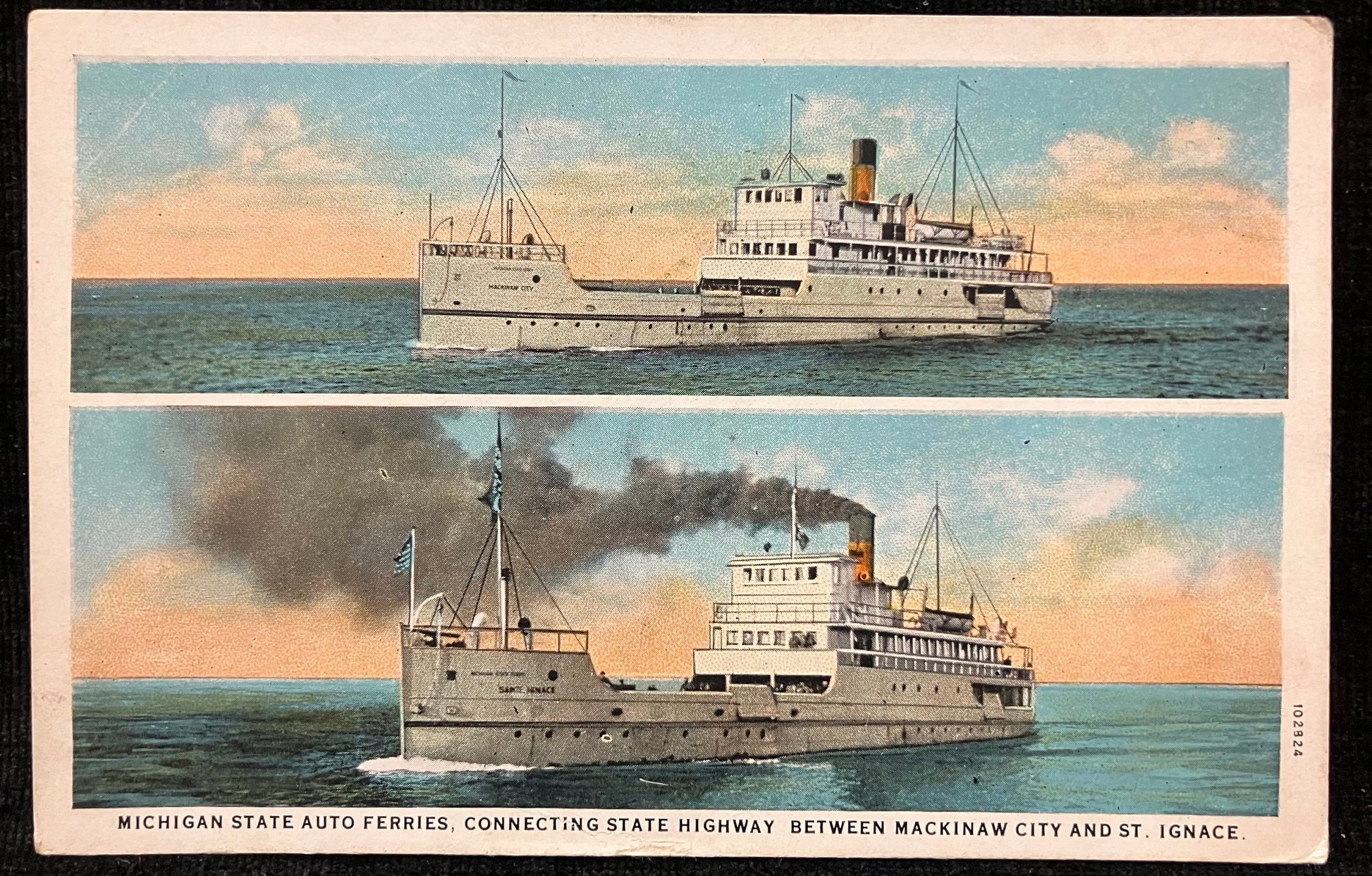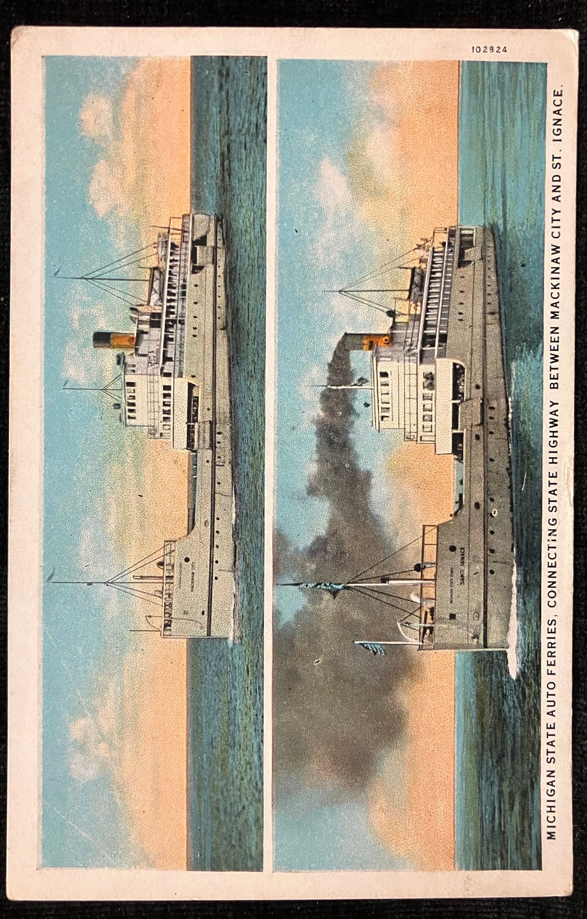 On front: Michigan State Auto Ferries, Connecting State Highway Between Mackinaw City and St. Ignace.