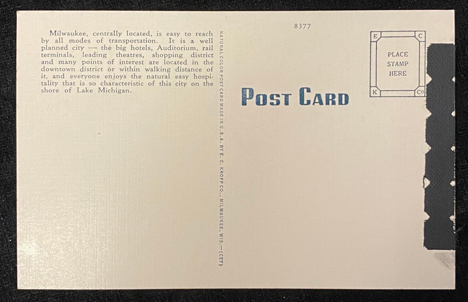 Back: Milwaukee, centrally located, is easy to reach by all modes of transportation. It is a well planned city - the big hotels, Auditorium, rail terminals, leading theatres, shopping district and many points of interest are located in the downtown district or within walking distance of it, and everyone enjoys the natural easy hospitality that is so characteristic of this city on the shore of Lake Michigan.