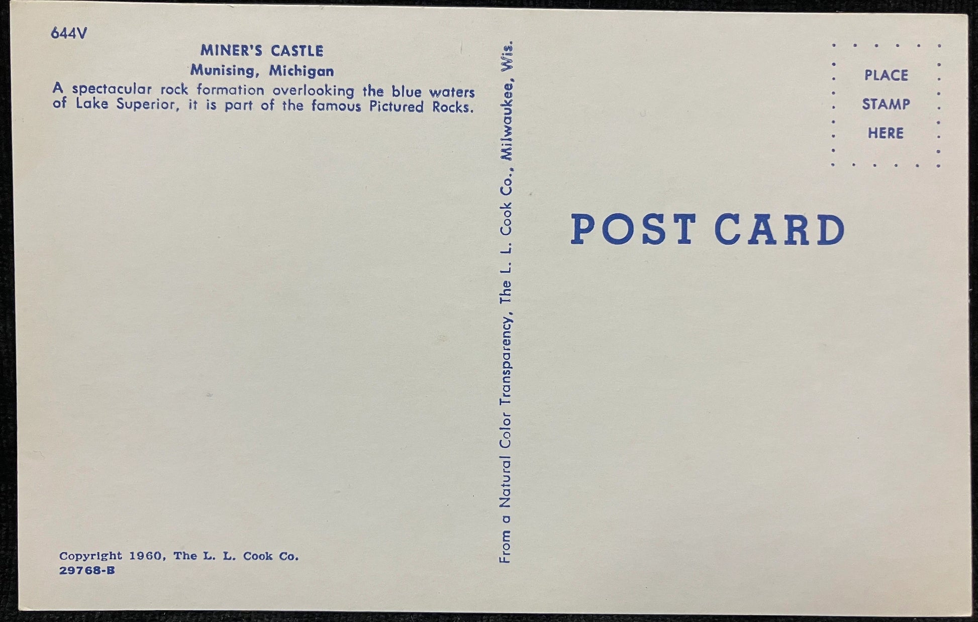 On back: MINER’S CASTLE Munising, Michigan A spectacular rock formation overlooking the blue waters of Lake Suprior, it is part of the famous Pictured Rocks. Copyright 1960