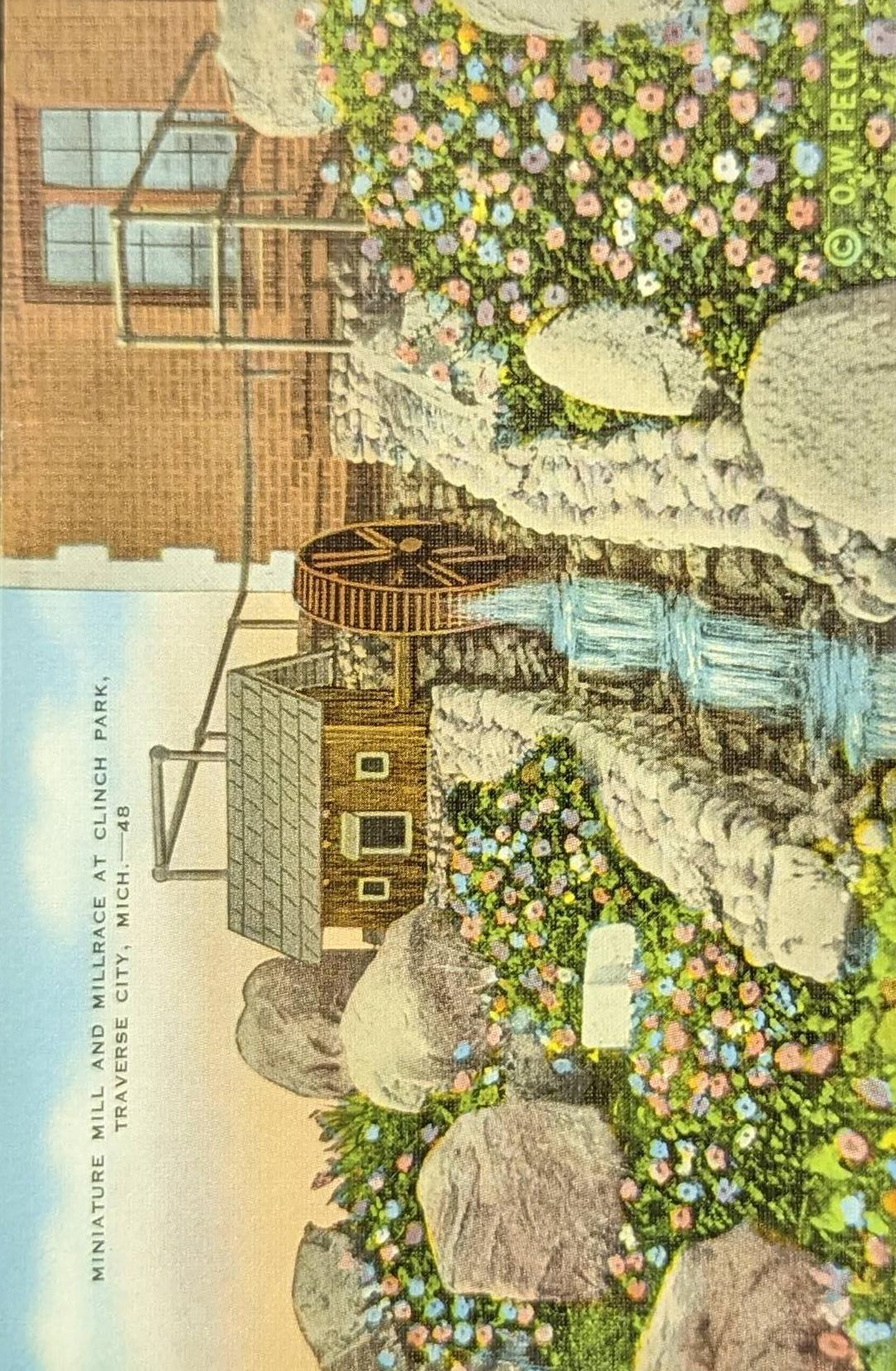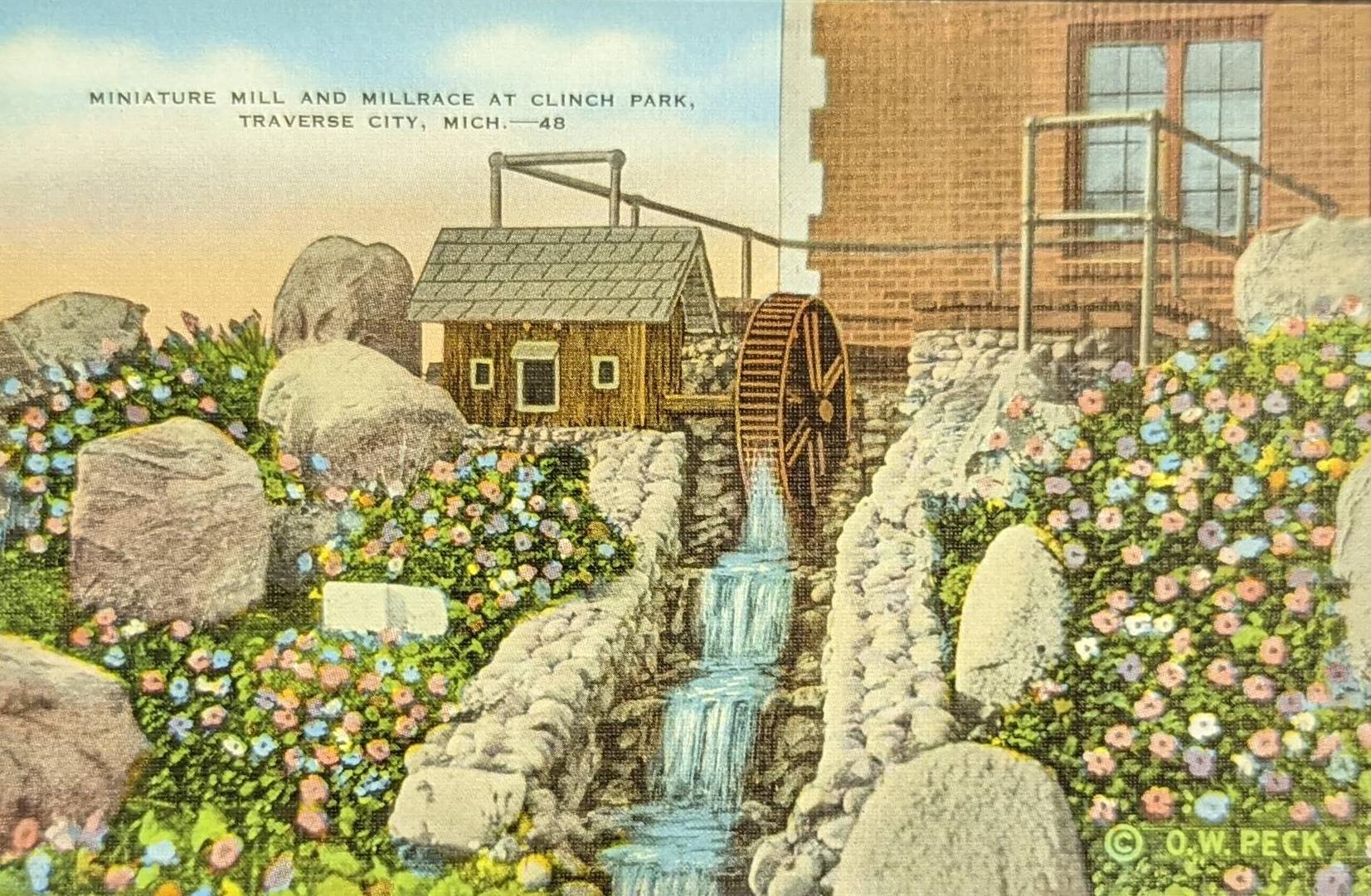 Miniature Mill and Millrace - Clinch Park - Traverse City, Michigan - 1940s Linen Postcard