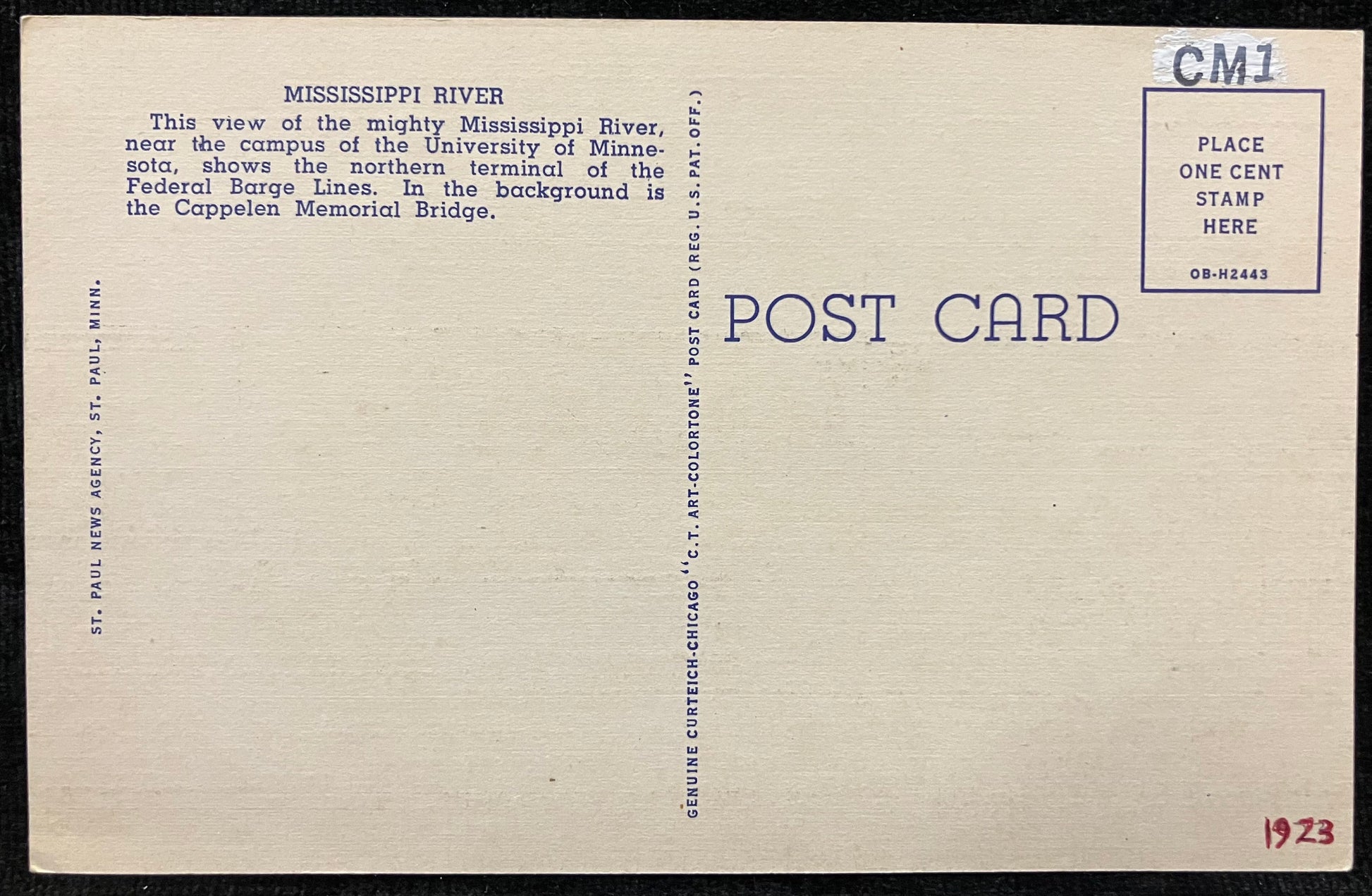 Back: MISSISSIPPI RIVER This view of the mighty Mississippi RIver, near the campus of the University of Minnesota, shows teh northern terminal of the Federal Barge Lines. In the background is the Cappelen Memorial Bridge