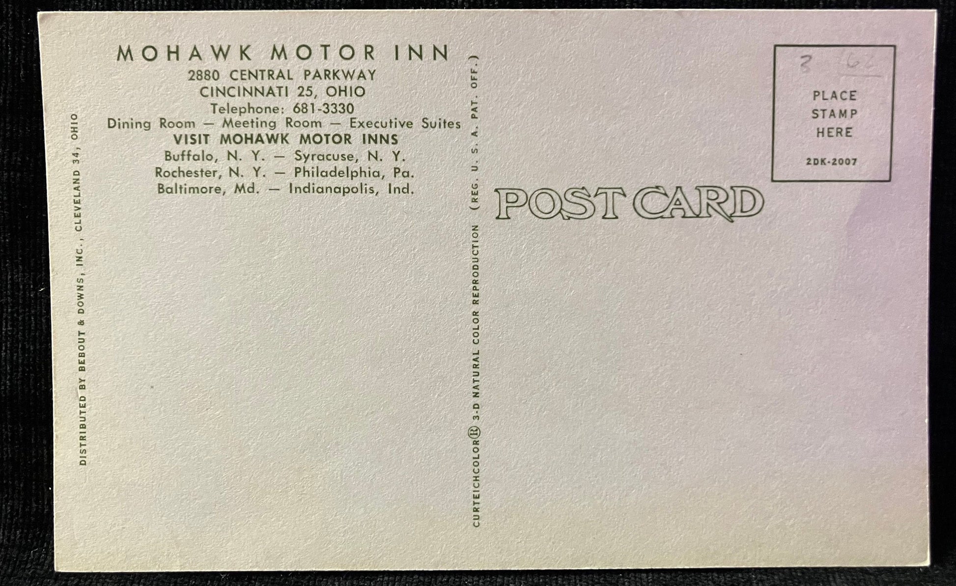 On front: A photo of the MOHAWK MOTOR INN in Cincinnati, Ohio