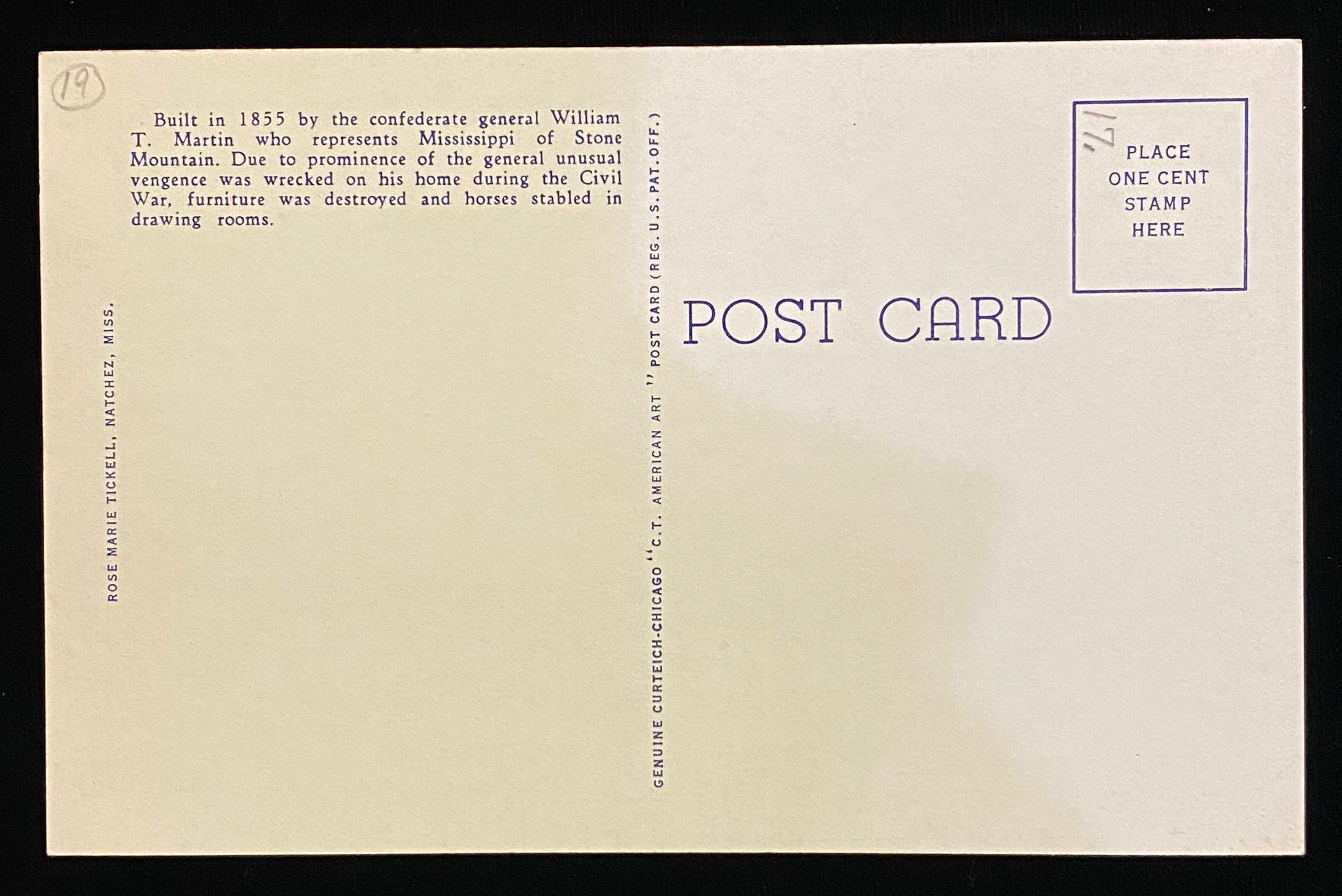 Back: "Built in 1855 by the confederate general William T. Martin who represents Mississippi of Stone Mountain. Due to prominence of the general unusual vengence was wrecked on his home during the Civil War, furniture was destroyed and horses stabled in drawing rooms."