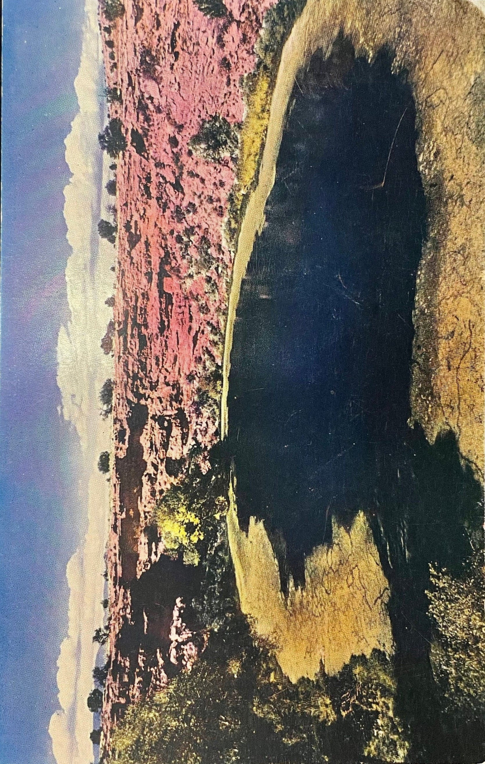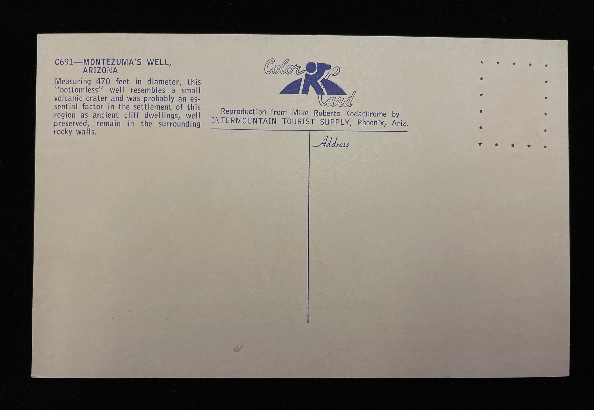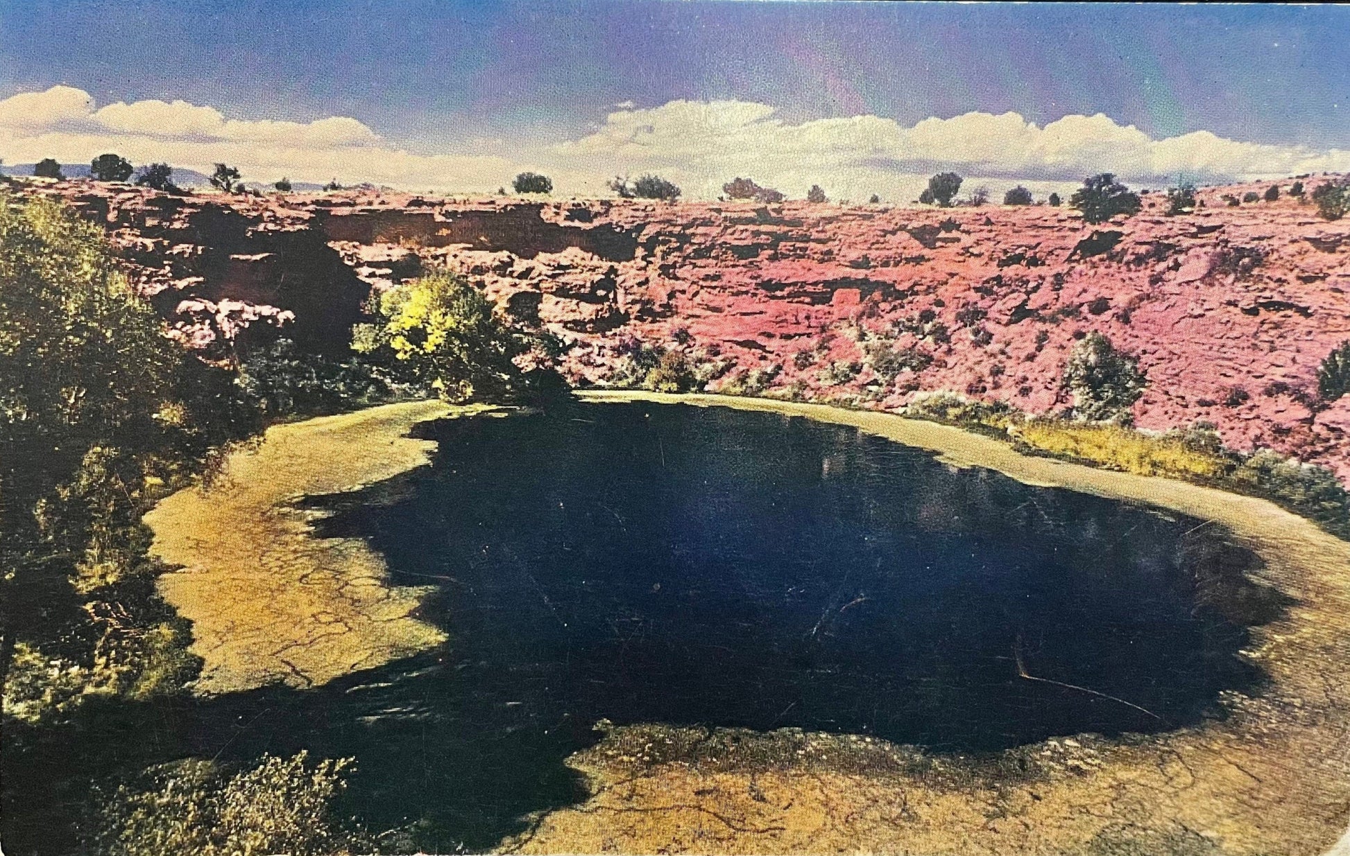 Back information- "Montezuma's Well, Arizona-- Measuring 470 feet in diameter, this "bottomless" well resembles a small volcanic crater and was probably an essential factor in the settlement of this region as ancient cliff dwellings, well preserved, remain in the surrounding rocky walls."