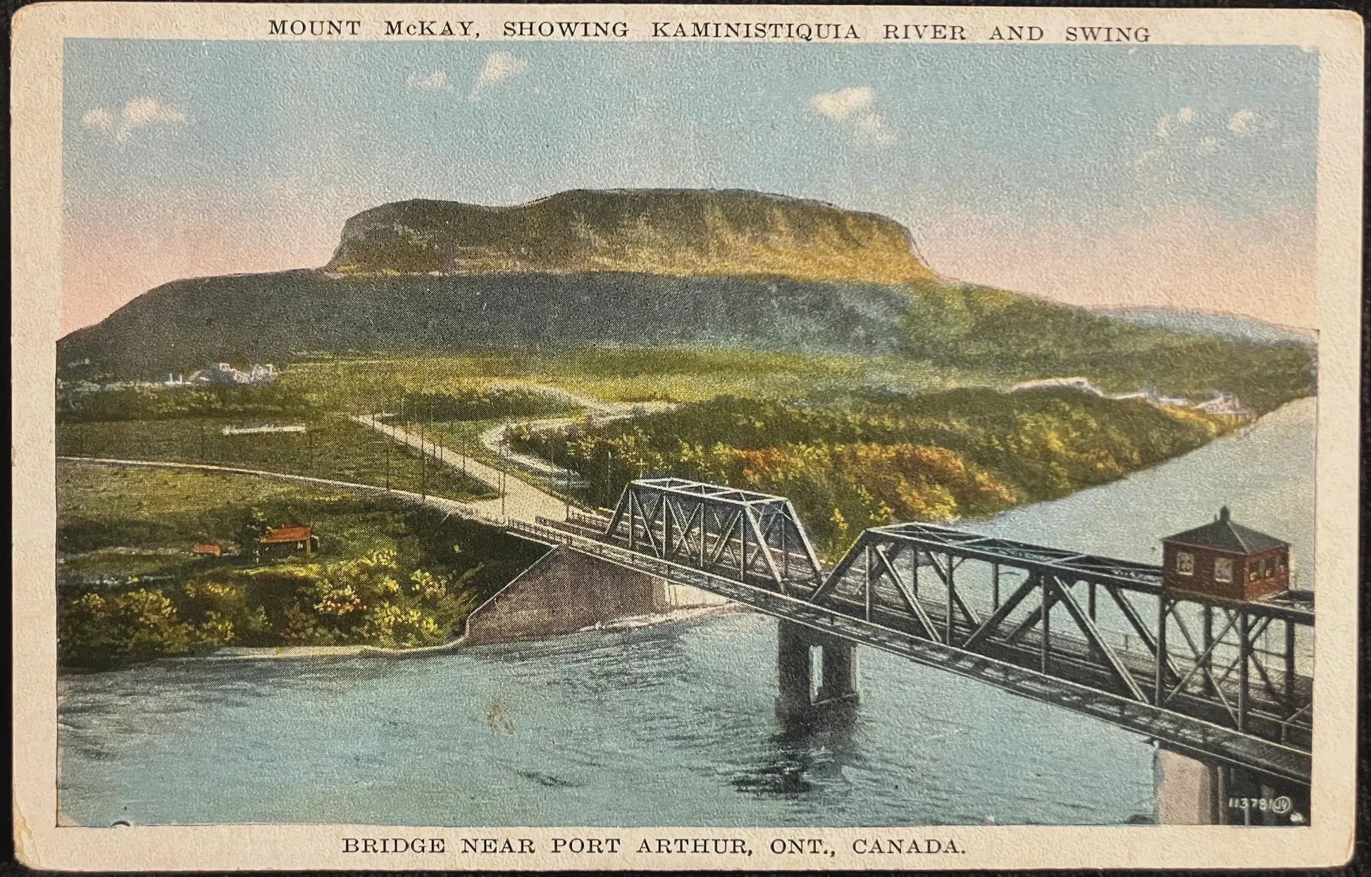 On front: Mount McKay, Showing Kaministiquia River and Swing - Bridge Near Port Arthur, Ont., Canada