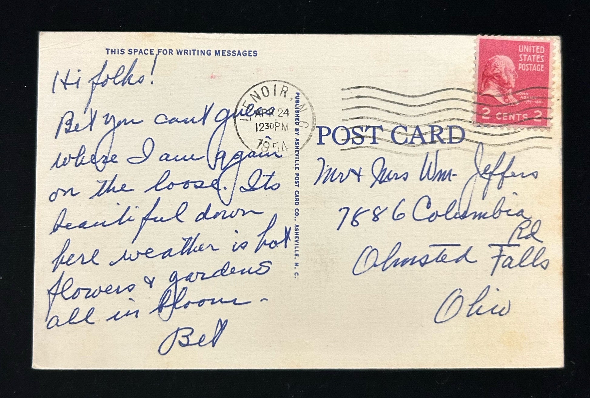 This postcard was sent from Lenoir, N.C. to Olmstead Falls, Ohio on April 24, 1954