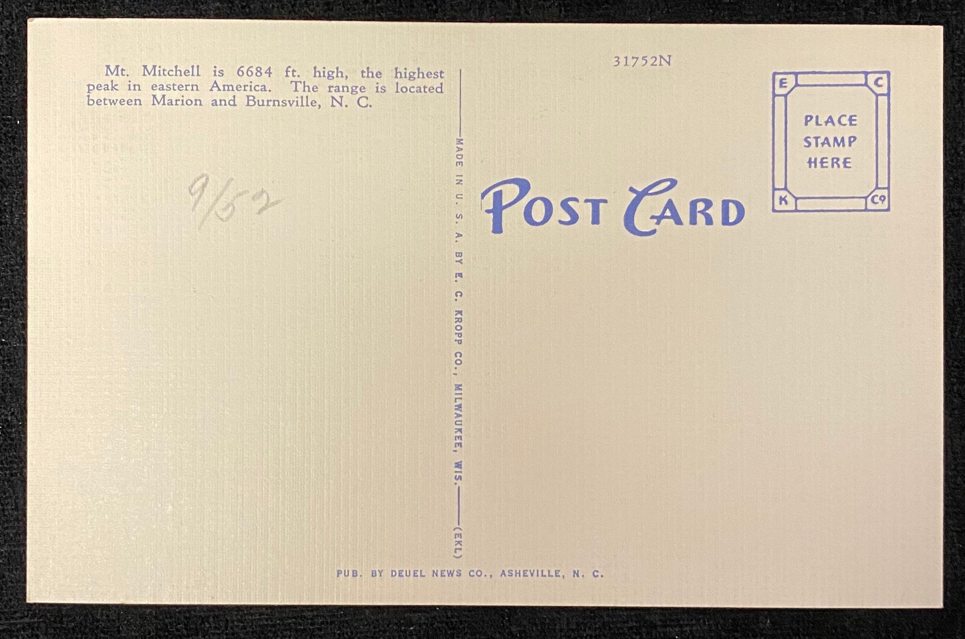 Back: "Mt. Mitchell is 6684 ft. high, the highest peak in eastern America. The range is located between Marion and Burnsville, N.C."