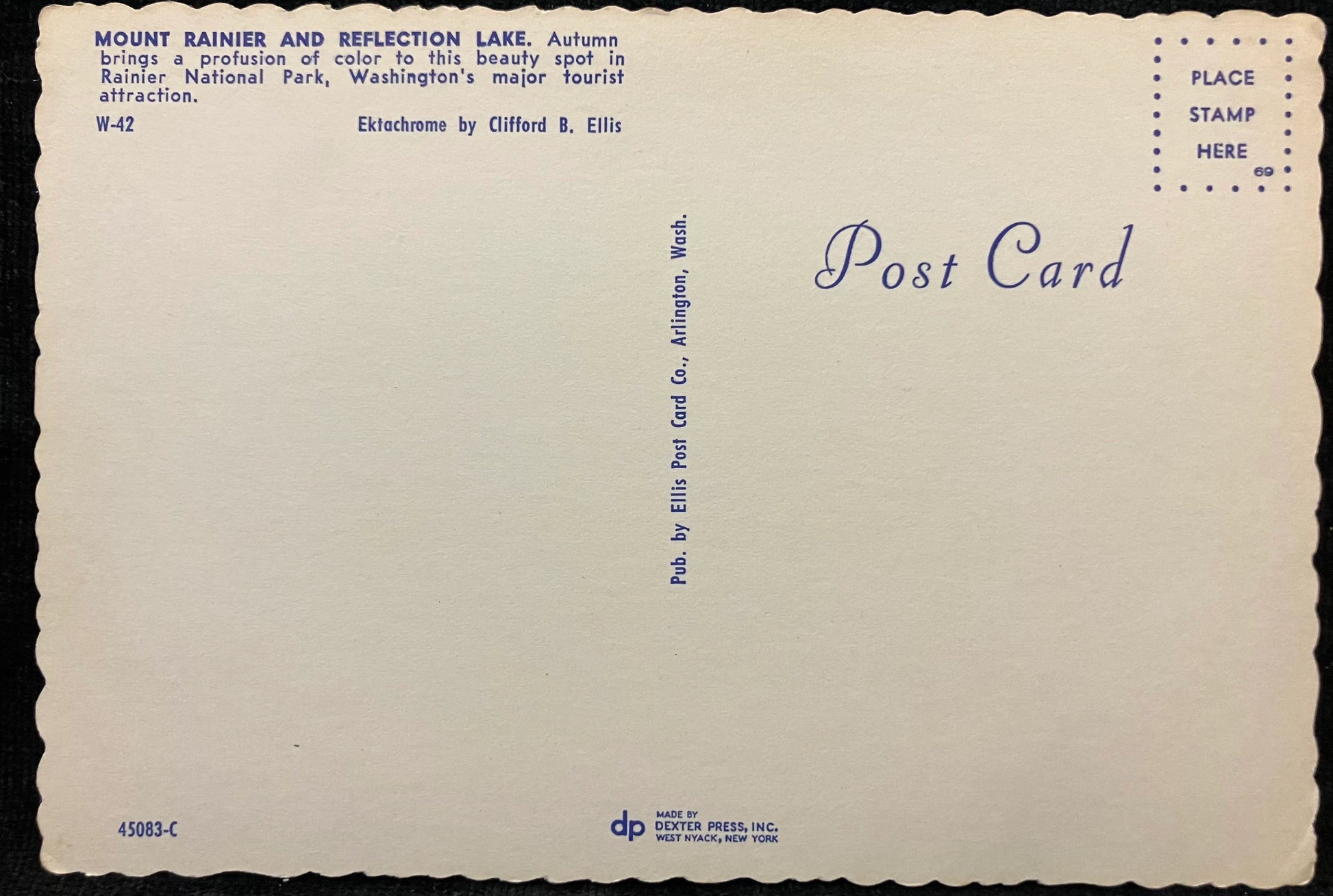 Mount Rainier and Reflection Lake, Rainer National Park, Washington - Ektachrome by Clifford B. Ellis - Vintage Postcard