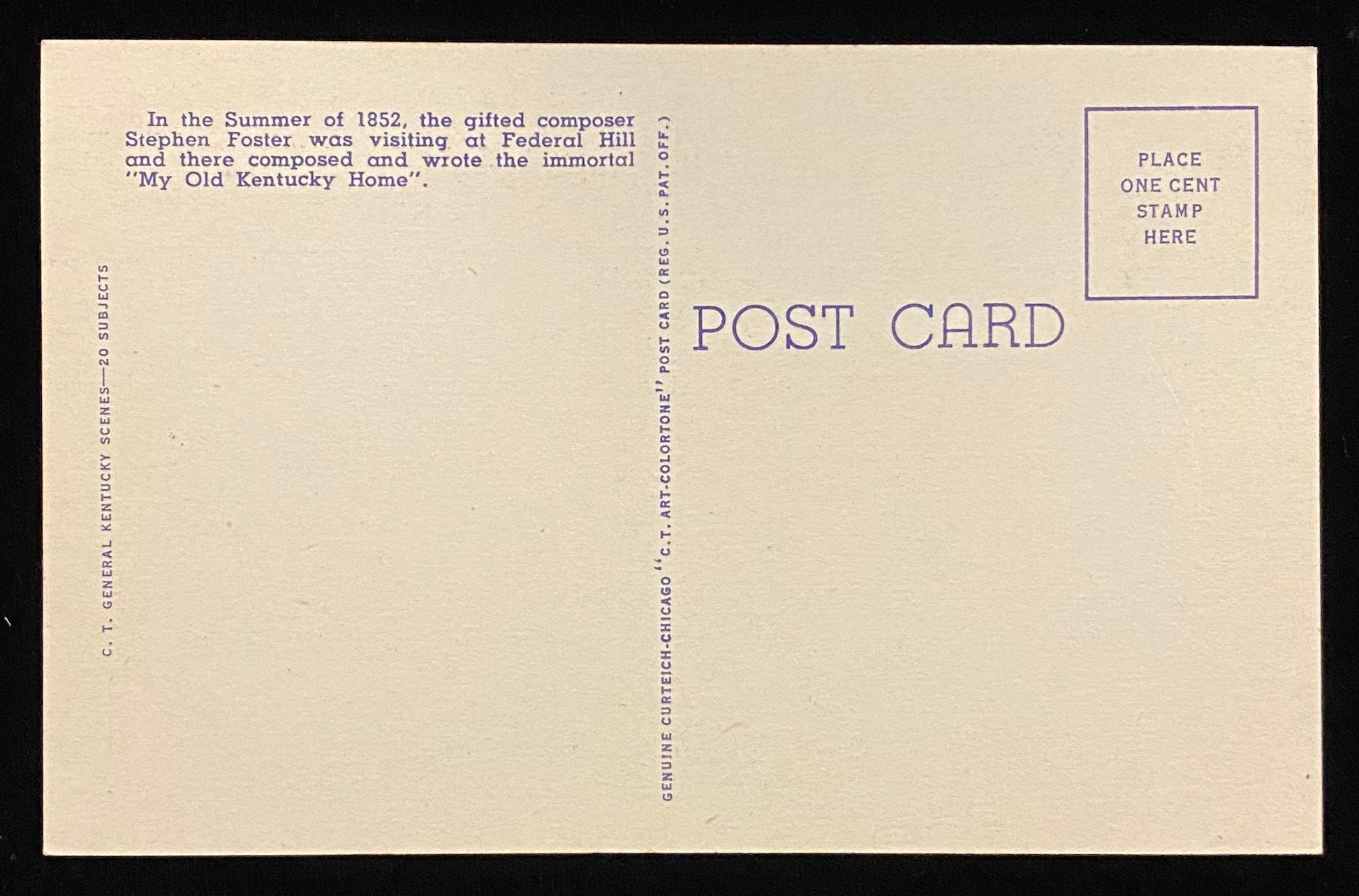 Back: "In the Summer of 1852, the gifted composer Stephen Foster was visiting at Federal Hill and there composed and wrote the immortal 'My Old Kentucky Home.'"