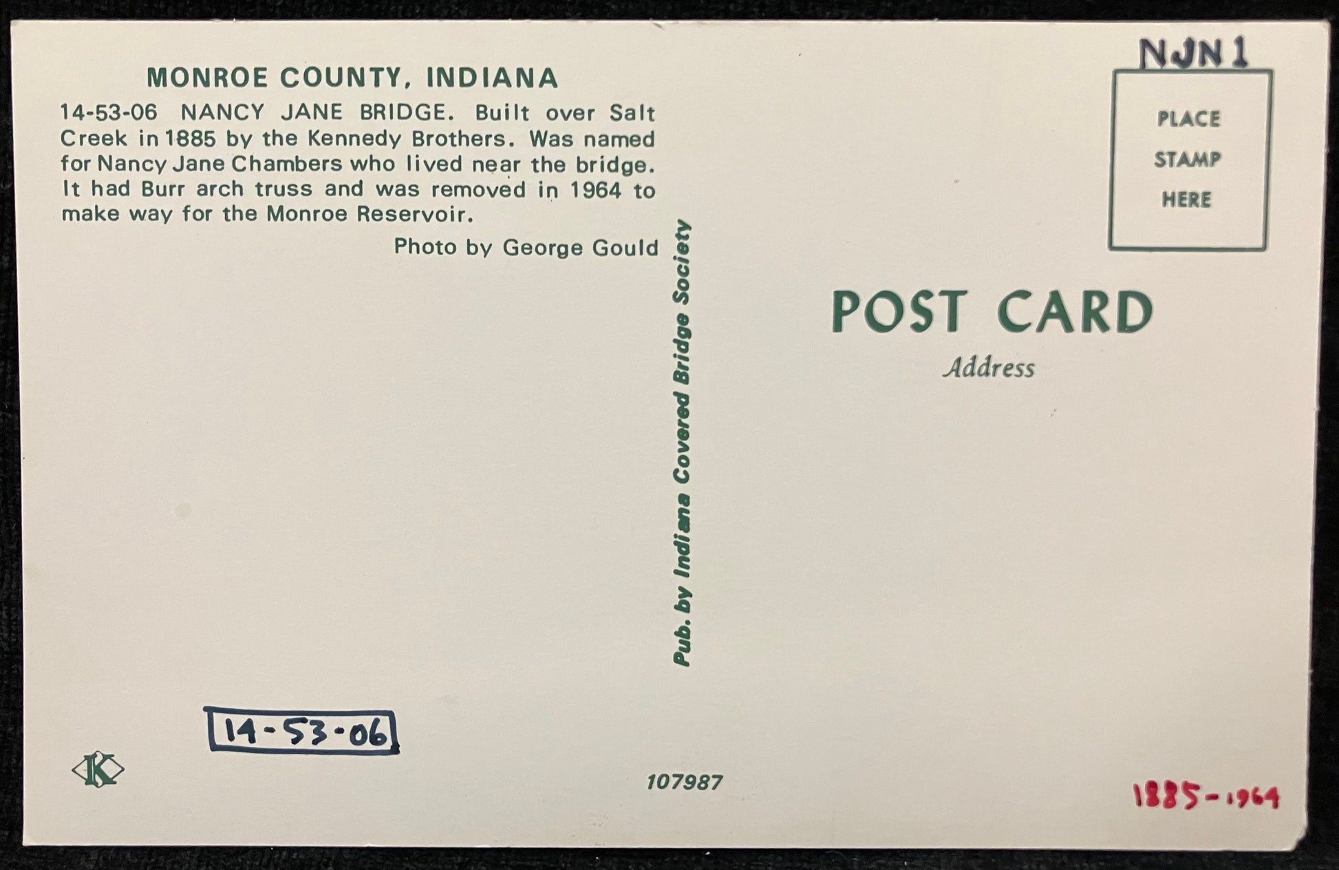 On back: Monroe County, Indiana 14-53-06 Nancy Jane Bridge. Built over Salt Creek in 1885 by the Kennedy Brothers. Was named for Nancy Jane Chambers who live near the bridge. It had Burr arch truss and was removed in 1964 to Mae the way for the Monroe Reservoir.