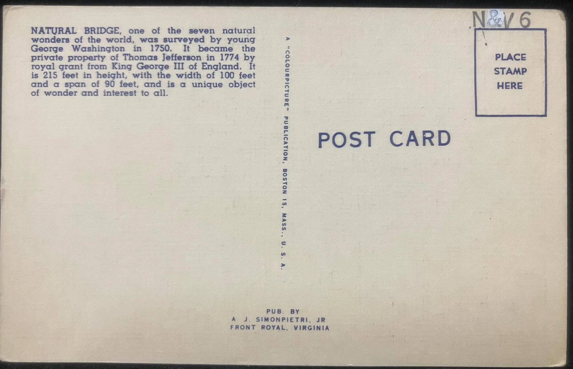 Back: NATURAL BRIDGE, one of the seven natural wonders oft world, was surveyed by young George Washington in 1750. It became the private property of Thomas Jefferson in 1774 by royal grant from King George III of England. It is 215 feet in height, with the width of 100 feet and a span of 90 feet, and is a unique object of wonders and interest to all.