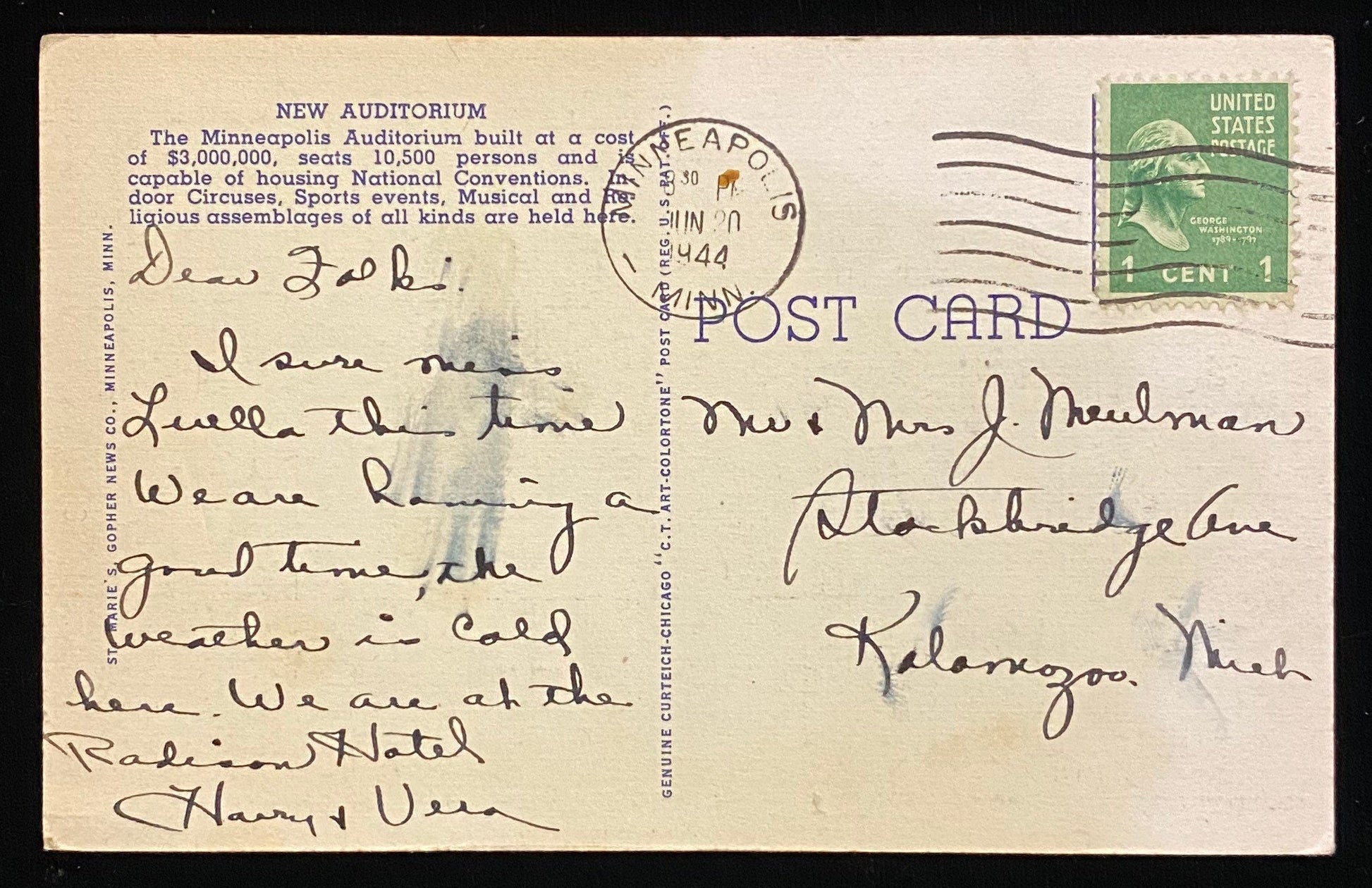 Back: "New Auditorium. The Minneapolis Auditorium built at a cost of $3,000,000, seats 10,500 persons and is capable of housing National Conventions. Indoor Circuses, Sports events, Musical and Religious assemblages of all kinds are held here."