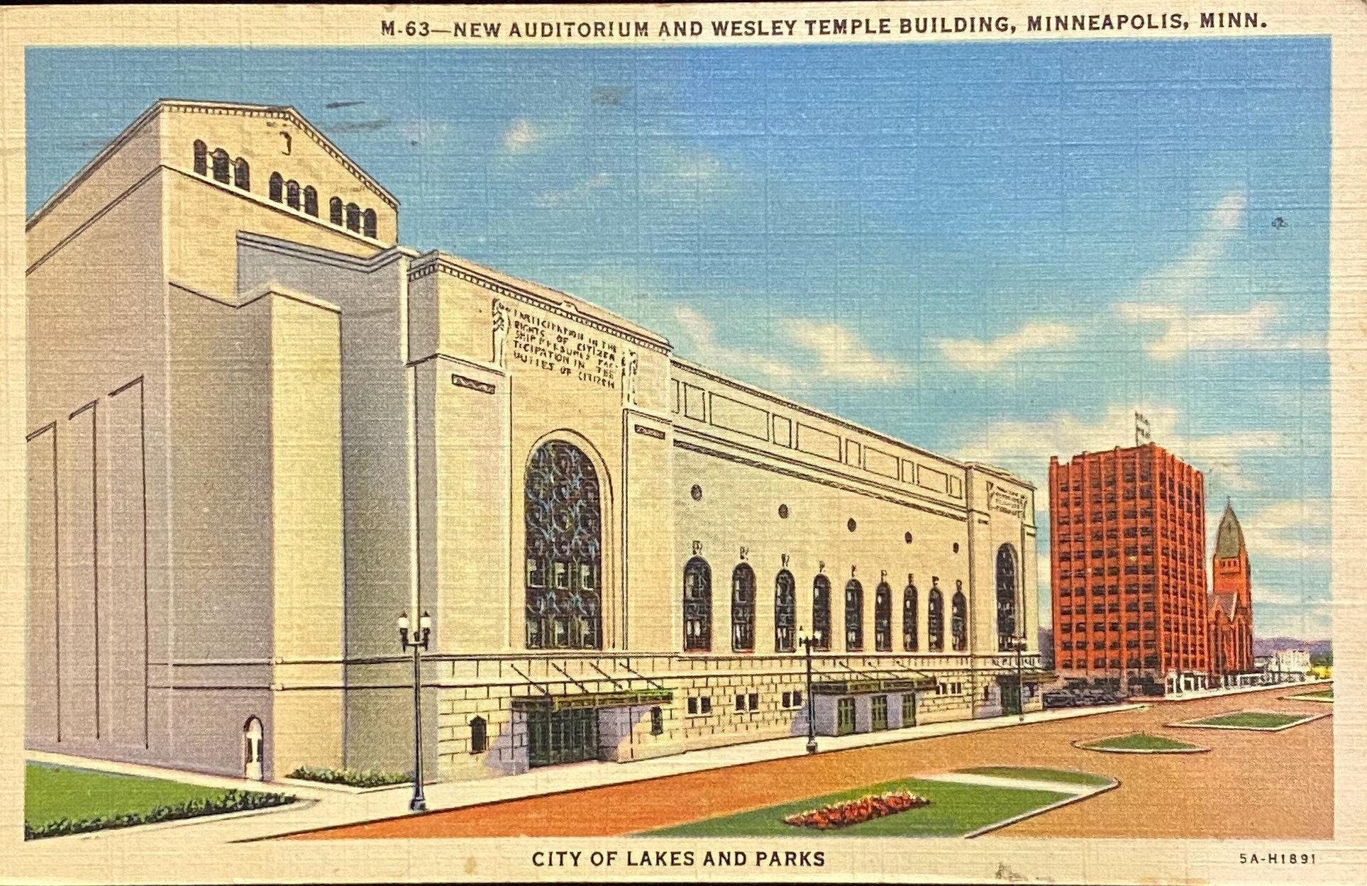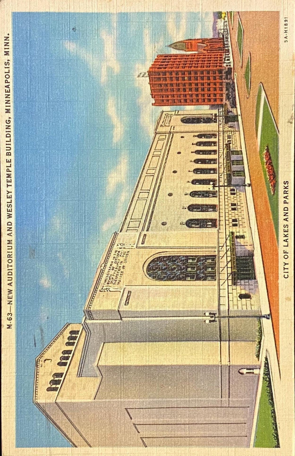 Front: New Auditorium and Wesley Temple Building, Minneapolis, Minn. - 1935 Linen Postcard