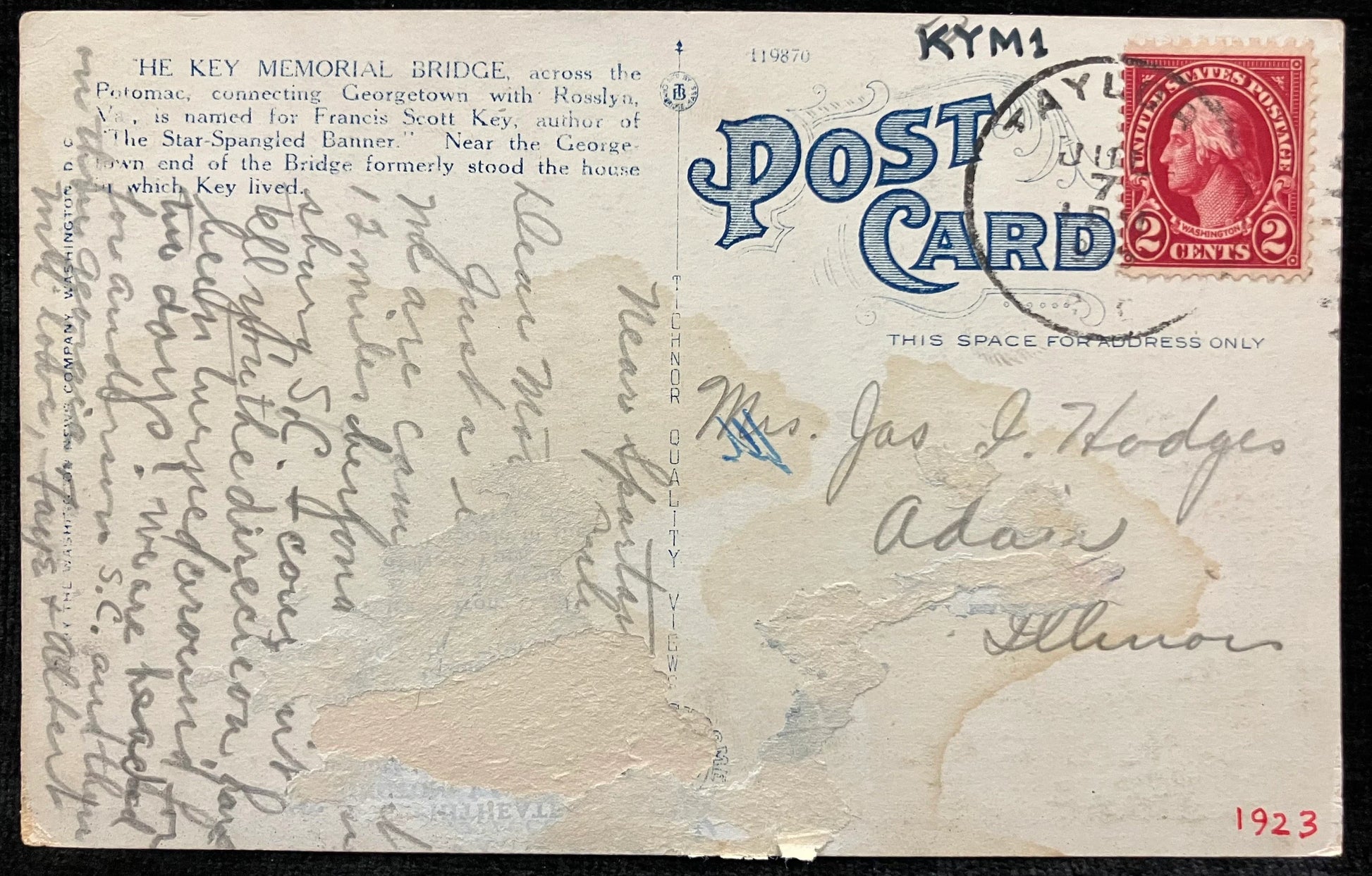 Back: THE KEY MEMORIAL BRIDGE, across the Potomac, connecting Georgetown with Rosssyln, Va. is named for Francis Scott Kry, author of “The Star Spangled Banner.” Near the Georgetown end of the Bridge formerly stood the house in which Key lived.