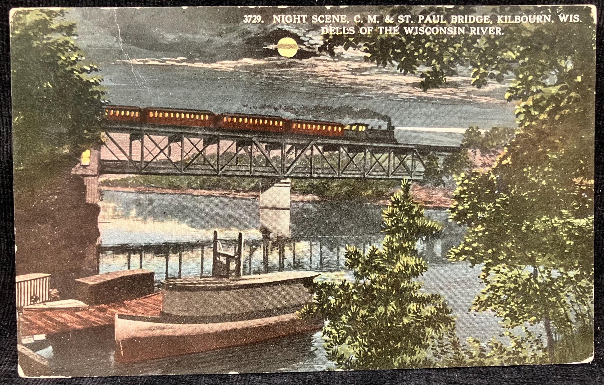 Night Scene - RARE - C. M. & St. Paul Bridge - Kilbourn, Wis. - Dells of the Wisconsin River - Railroad Bridge Postcard - Rare Nighttime RR Photo