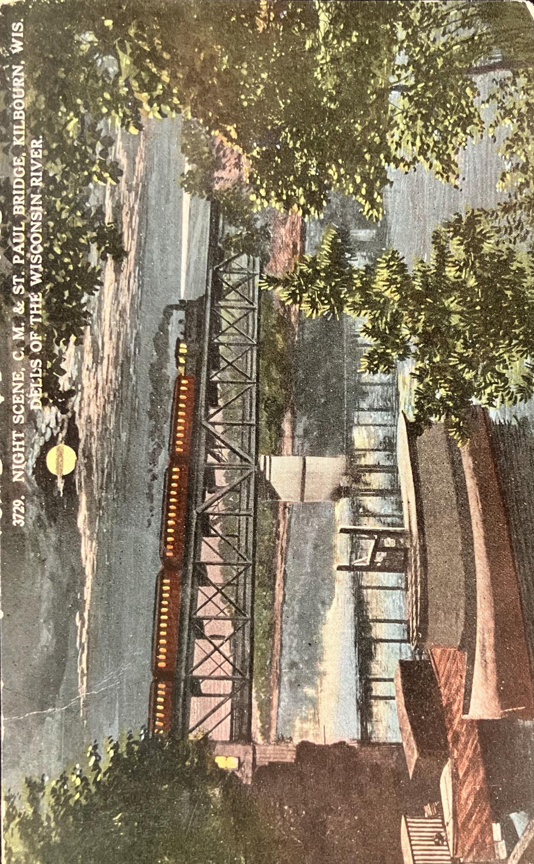 Front: Night Scne, C. M. & St. Paul Bridge, Kilbourn, Wis. Dells of the Wisconsin River.